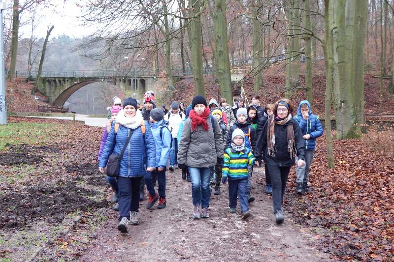 Tym razem mieliśmy szczęście! W sobotę 2 grudnia nie padało! Nawet czasami zaświeciło słońce. Na 967 Leśną Sobotę wybrało się 67 zapalonych turyst, odpowiednio ubranych do wędrówki po kałużach i błocie. Na rajd wyruszyliśmy sprzed jeziora Szmaragdowego zielonym szlakiem. Po drodze mijaliśmy kamienne drogowskazy (jakże przydatne w wędrówce po puszczy) oraz wiele ciekawych okazów pomnikowych drzew i głazów. Gdy dotarliśmy do Szwedzkiego Kamienia zmieniliśmy kolor szlaku na żółty. Podchodziliśmy pod górę drogą Ganek, z której roztaczał się piękny widok na dolinę Marzanny. Miejscem złazu była polana Psie Pole z okazałym dębem Myśliwych. Po krótkim odpoczynku wróciliśmy niebieskim szlakiem do autobusu.