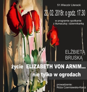 Bohaterką wieczoru będzie odkryta i przypominana przez szczecińską dziennikarkę Elżbietę Bruską, popularyzatorkę hrabiny z Rzędzin koło Dobrej, Elizabeth von Arnim. Tę uznaną pisarkę sprzed stu lat i jej książki promuje Elżbieta Bruska, przekłada jej książki, wydaje, z pasją opowiada na spotkaniach o fascynującym życiu swojej bohaterki, ilustruje bogatą prezentacją archiwalnych fotografii. Na 51. wieczór W Pałacu literacko rozpoczynający tegoroczne spotkania w Pałacu zaprasza Róża Czerniawska-Karcz, która poprowadzi rozmowę z gościem wieczoru.
