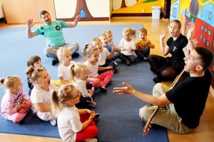 Zajęcia w grupach odbywają się w każdą środę. Na pierwszym spotkaniu 3 października, dzieci świetnie się bawiły poznając kroki do tańca o wdzięcznej nazwie „gołąbek”, wysłuchały również brzmienia gitary i ludowej piosenki o pewnym koniku.