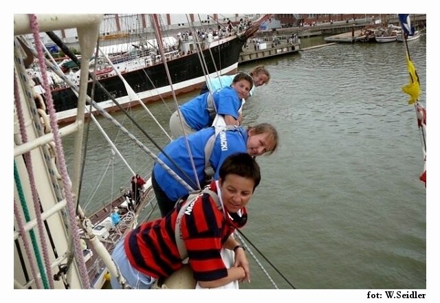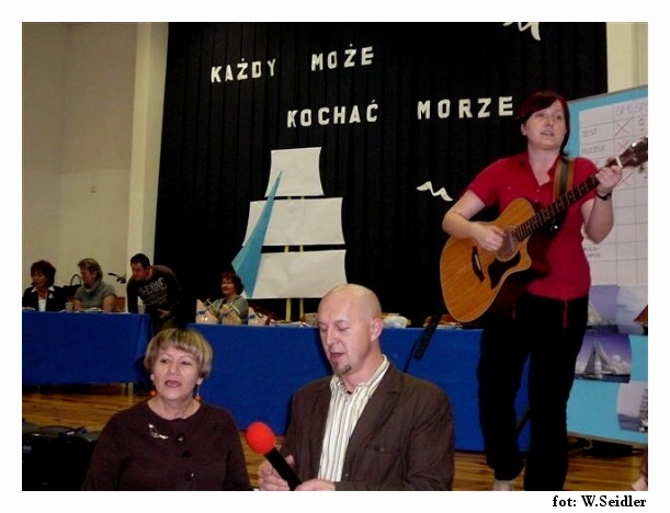 Ta specjalna, honorowa nagroda – Belfer na Szóstkę – jest wyróżnieniem, które Związek Nauczycielstwa Polskiego corocznie przyznaje i wręcza nauczycielom – pasjonatom, społecznikom, wzorowym wychowawcom dzieci i młodzieży. Do tegorocznej edycji tej nagrody nominowanych było 13 szczecińskich pedagogów, spośród których jury konkursowe przyznało tytuł „Belfra na Szóstkę” Beacie Samborskiej z SP 13. Oprócz tego przyznane zostały dwa tytuły Wicebelfrów, a ponadto trzy wyróżnienia – jedno z nich odebrała Bożena Godlewska, emerytowana, ale stale zaangażowana społecznie nauczycielka Szkoły Podstawowej nr 37 im. kpt..ż.w. Antoniego Ledóchowskiego, na Os. Słonecznym. Jak na „morską” szkołę przystało żywe są w niej tradycje i zwyczaje morskie, a istniejące od początku jej działalności Szkolne Koło Edukacji Morskiej należy do najlepszych w naszym Programie. Koło to założyły i przez wiele lat prowadziły dwie pasjonatki edukacji morskiej –Krystyna Dzienisiewicz i właśnie Bożena Godlewska, przy stałym wsparciu ówczesnej dyrektor SP 37 Róży Uścinowicz. Obie Opiekunki Koła były aktywne w szkole i na wodzie, w konkursach i w szantach (jak na zdjęciach), m.in. w nauczycielskim zespole „Pół Żartem – Na Serio”. Obie już są na emeryturze, ale mam nadzieję, że zespół wystąpi jeszcze z szantą na naszej jubileuszowej Galii z okazji 15-lecia Programu, którą planujemy na 24 listopada br. Ich dobrą robotę z SKEM kontynuuje teraz Dorota Klimek.