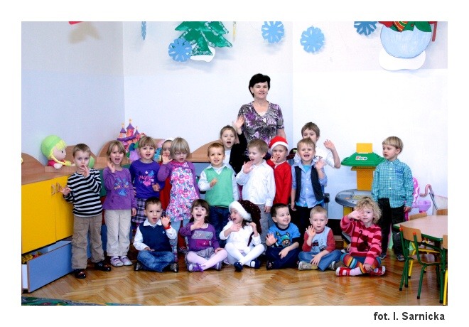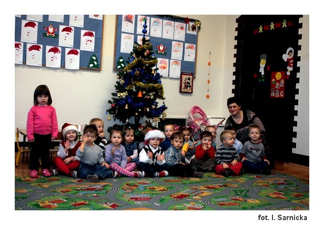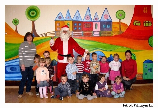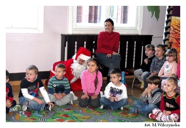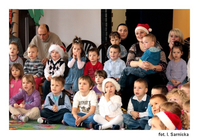 „Mikołaju, Mikołaju na Ciebie czekamy też. Moc prezentów nam przyniesiesz, o czym marzę dobrze wiesz!” – to refren piosenki, którą przedszkolaki przygotowały na spotkanie z Mikołajem. Tak głośno ją śpiewały, że Mikołaj usłyszał i przybył do Pałacu. Nie był sam, wraz z nim przybyli aniołek i diabełek z przedstawieniem teatralnym. A było tak: Mały czarcik, jak to mają w zwyczaju diablątka zrobił Mikołajowi psikusa i schował jego worek z prezentami. Na całe szczęście wszystko widziały dzieciaki i podpowiedziały Mikołajowi, gdzie są tak długo wyczekiwane prezenty. Przygoda Mikołaja skończyła się szczęśliwie i mógł rozdać dzieciom prezenty. Po spektaklu były kolędy, tańce i konkurs rzutu śnieżkami. Na koniec każdy miał okazję usiąść Mikołajowi na kolanach, przytulic i podziękować za wspólną zabawę.