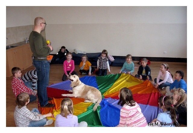 Na zakończenie zajęć odbyła impreza pt. „Trening umiejętności społecznych”,z udziałem psa terapeutycznego, podczas której dzieci uczyły się jak bezpieczne radzić sobie ze stresem i trudnymi emocjami, rozpoznawać je i nazywać. Gaja, pies rady golden retriver, pokazywał dzieciom wiele sztuczek, ściągał im buty, czapki – było mnóstwo radości i zabawy!