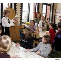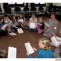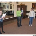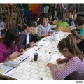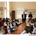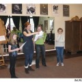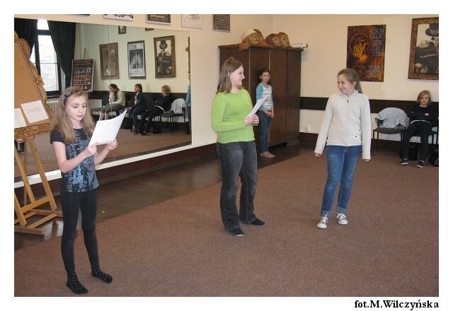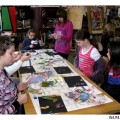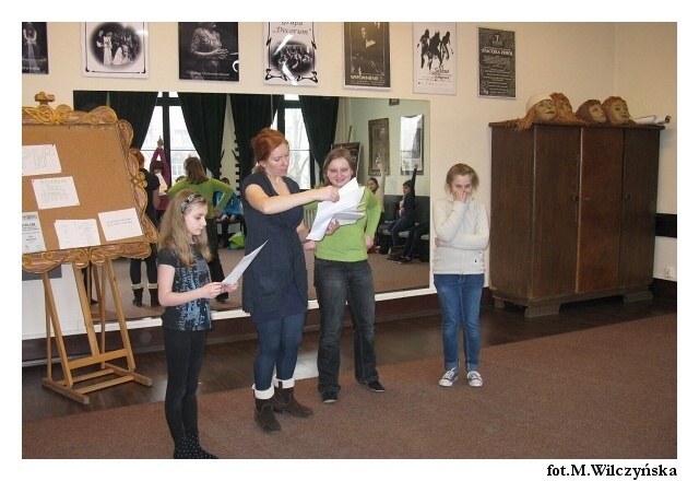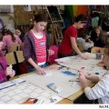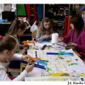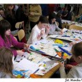 Na zajęciach plastycznych dzieci kończyły swoje kompozycje transparentne z folii przezroczystych, które potem zawisły na szybach pałacowych korytarzy. Na zajęcia teatralne każdy miał przygotować sam lub w parze krótką reklamę wymyśloną przez siebie. Oj, było bardzo ciekawie! Dwie uczestniczki zajęć nie chciały zejść ze sceny – tyle miały do przekazania publiczności. 🙂 Brawo, dziewczyny!