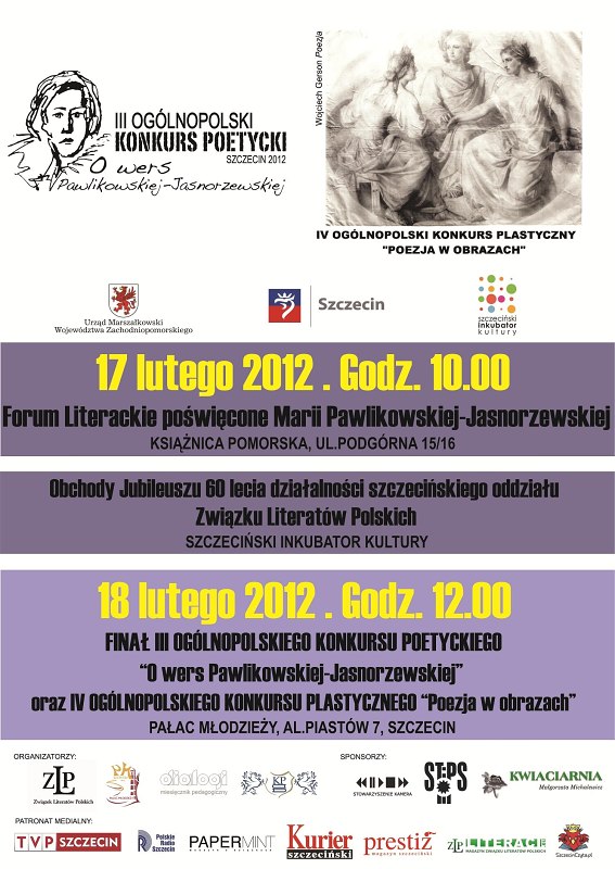 III Ogólnopolski Konkurs Poetycki „O wers Pawlikowskiej-Jasnorzewskiej” Szczecin 2012 – adresowany do młodzieży gimnazjalnej i szkół ponadgimnazjalnych w całej Polsce, którego nadrzędnym celem jest poszukiwanie i promowanie młodych talentów oraz powszechnie pojmowana promocja poezji został podsumowany. Uroczyste wręczenie nagród oraz dyplomów odbędzie się 18 lutego o godz. 12.00 w auli Pałacu Młodzieży w Szczecinie.