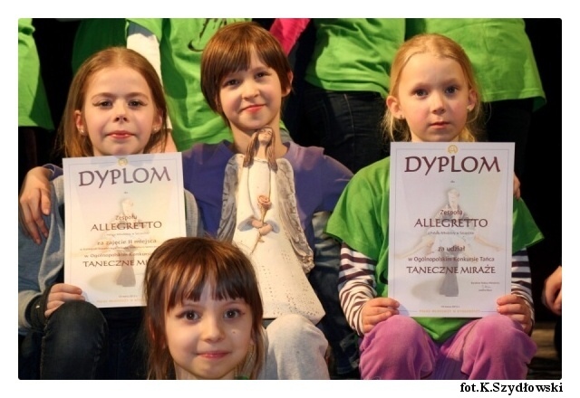 Zespół Allegretto z pracowni Tańca Współczesnego prowadzonej przez p. Ewę Szachoń zajął II miejsce w Ogólnopolskim Konkursie Tańca „Taneczne Miraże 2012”, który odbył się 10 marca b.r. w Pałacu Młodzieży w Bydgoszczy.