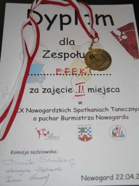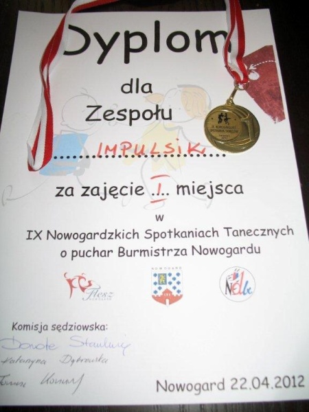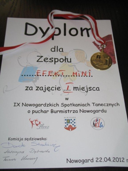 Dużym sukcesem zakończył się udział zespołów z pracowni gimnastyczno – tanecznej pani Doroty Lindner –Baran, które 22 kwietnia 2012r. wystąpiły w Konkursie Tańca w Nowogardzie. Od 9 lat ten konkurs gromadzi najlepsze zespoły z województwa zachodniopomorskiego. W tym roku do rywalizacji stanęło 86 zespołów w trzech kategoriach wiekowych. W sumie zaprezentowało się ponad 1200 tancerzy. W najmłodszej kategorii do lat 10 zespół Impulsik w choreografii „Magia muzyki” i Efekt Mini w choreografii „Pomponowy Dance” zajęły ex aequo I miejsce. W tej kategorii wystąpiło 36 zespołów. Zespół Impuls występujący w kategorii 11-14 lat okazał się bezkonkurencyjny. Za wspaniałe wykonanie choreografii „Zmierzch” jury przyznało dziewczętom I miejsce. W tej kategorii wystąpiło 29 zespołów. Najstarszy zespół Efekt wystąpił w kategorii wiekowej powyżej 14 lat. Z choreografią „Zagubiona” w gronie 19 zespołów uplasował się na II miejscu. Poziom imprezy był bardzo wysoki. Dziewczęta z pracowni gimnastyczno – tanecznej na każdym konkursie potwierdzają swoje umiejętności przywożąc najwyższe laury.