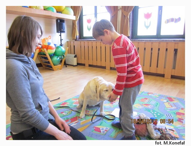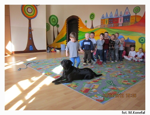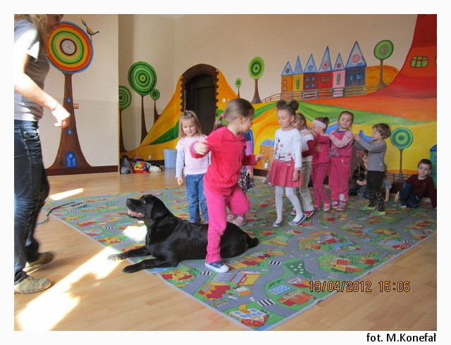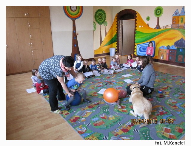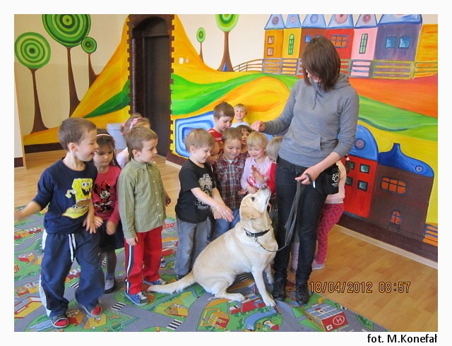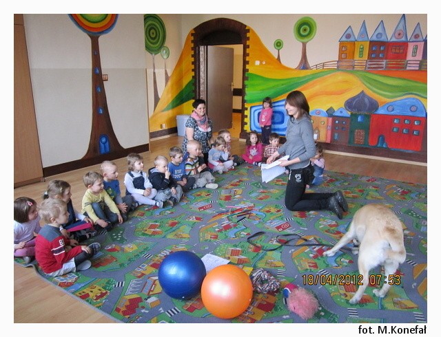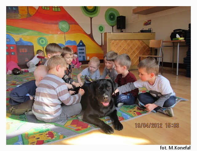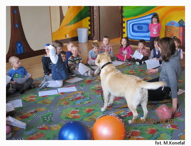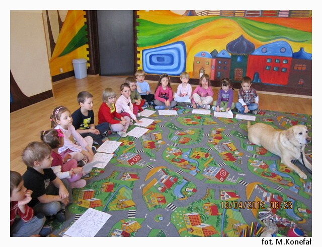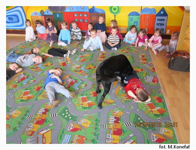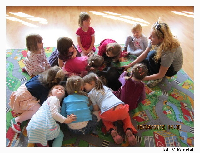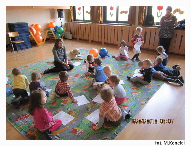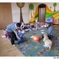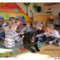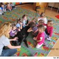 Tego dnia nasze przedszkolaki z wielką niecierpliwością wypatrywały czworonożnych gości. Grupy poranne zaszczyciła swoją obecnością Aura. Wspólnie słuchaliśmy opowiadania, następnie kolorowaliśmy obrazki. Zabawy z Aurą oraz jej karmienie, pokazały jak bardzo dzieci przełamały swój lęk przed kontaktem z czworonogami.