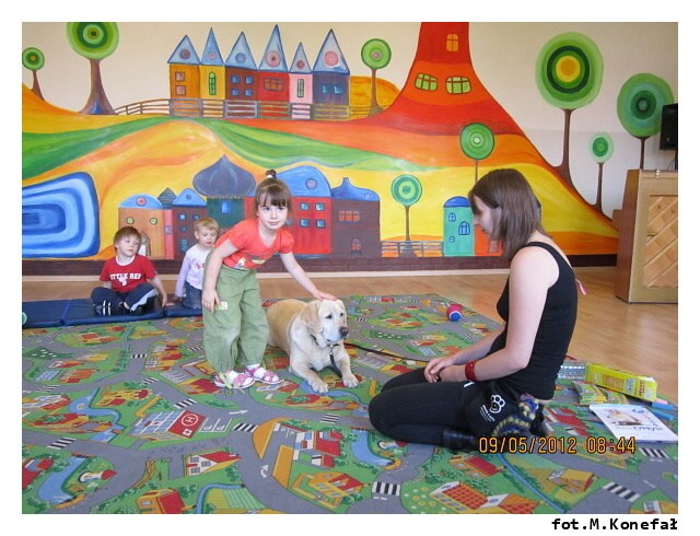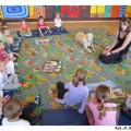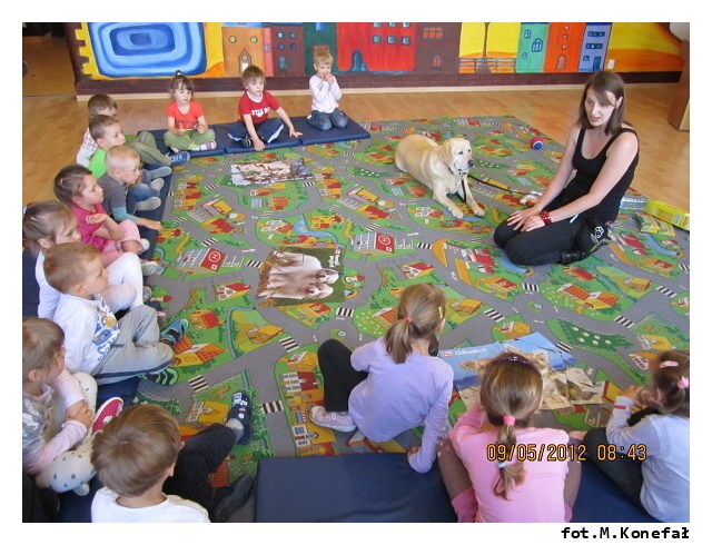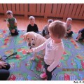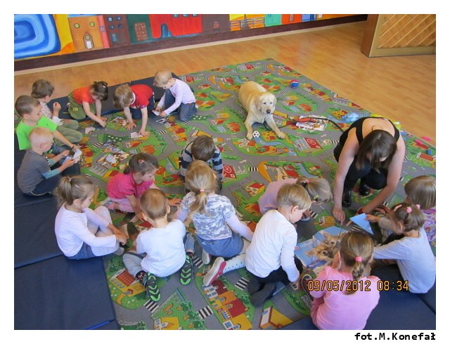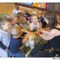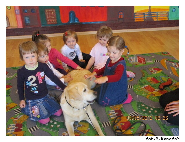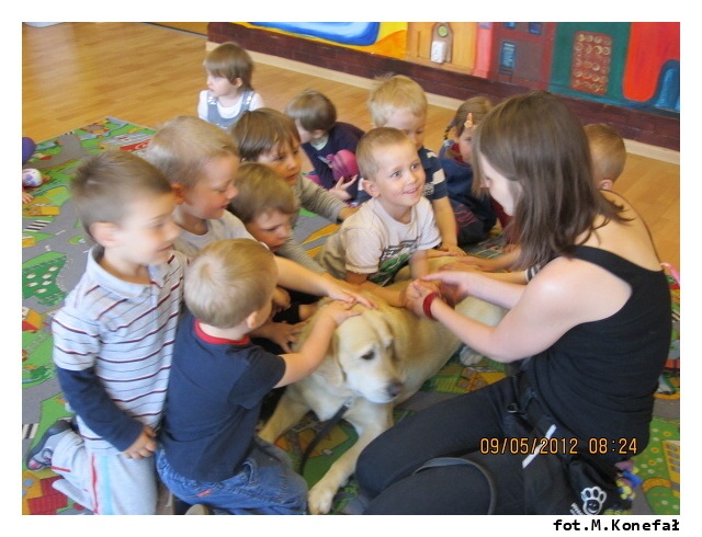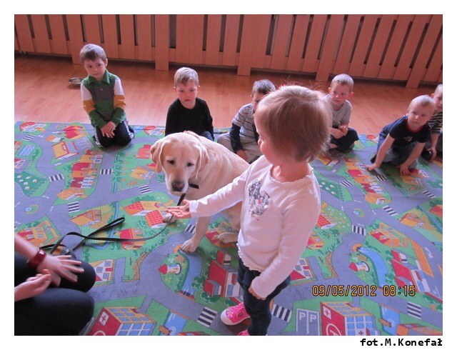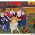 Na początku maja po raz kolejny do naszej Akademii Edukacji Przedszkolaka zawitał bardzo miły gość. Aura ze swoją panią przygotowały dla dzieci z grup porannych mnóstwo atrakcji. Na początku wspólnie układaliśmy pocięte kawałki puzzli. Wszyscy doskonale poradzili sobie z zadaniem. Potem bawiliśmy się z labradorem. Jak zawsze spotkanie dostarczyło dzieciom wiele emocji i radości. Na długo pozostanie w naszej pamięci.