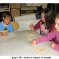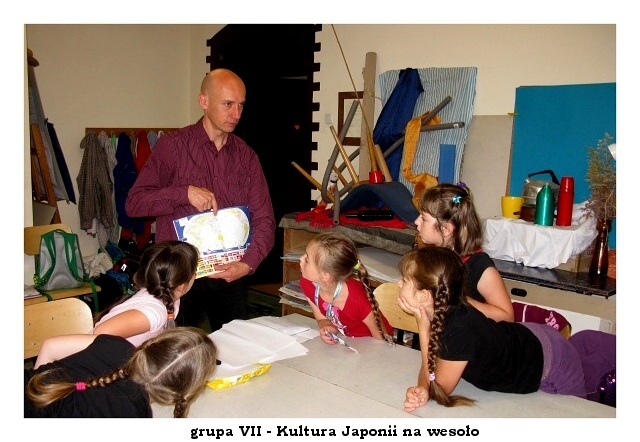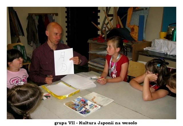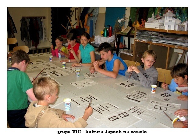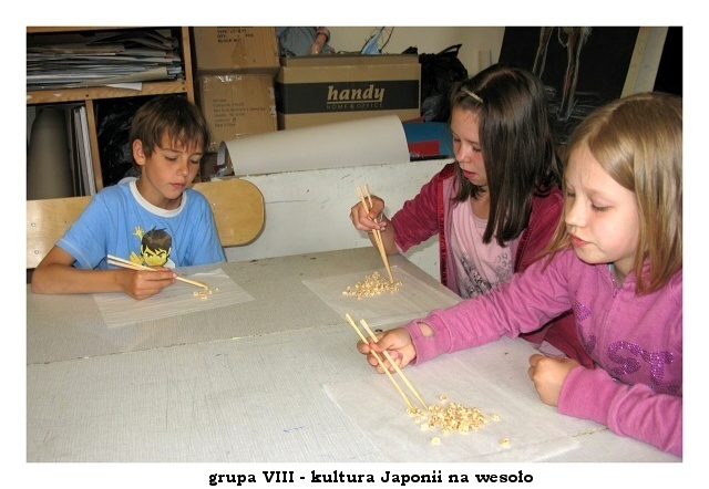 Na zajęciach o kulturze Japonii dzieci uczyły się rozpoznawać a także pisać japońskie znaki. Potem przyszedł czas na opanowanie sztuki jedzenia pałeczkami. Jak można się domyślić nie było to takie proste! W nagrodę można było zjeść prażoną pszenicę, ale tylko tę włożoną do ust pałeczkami.