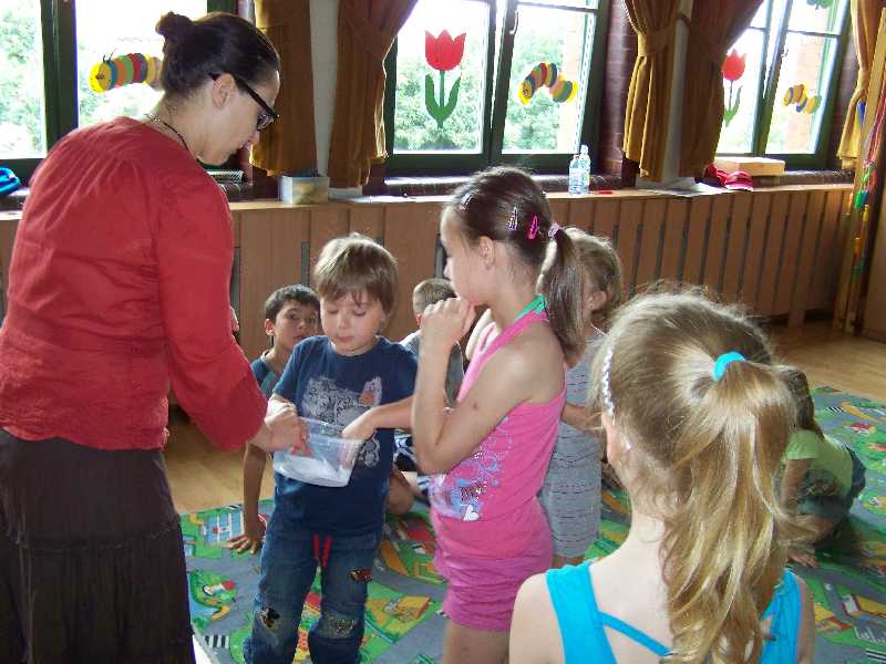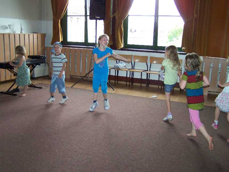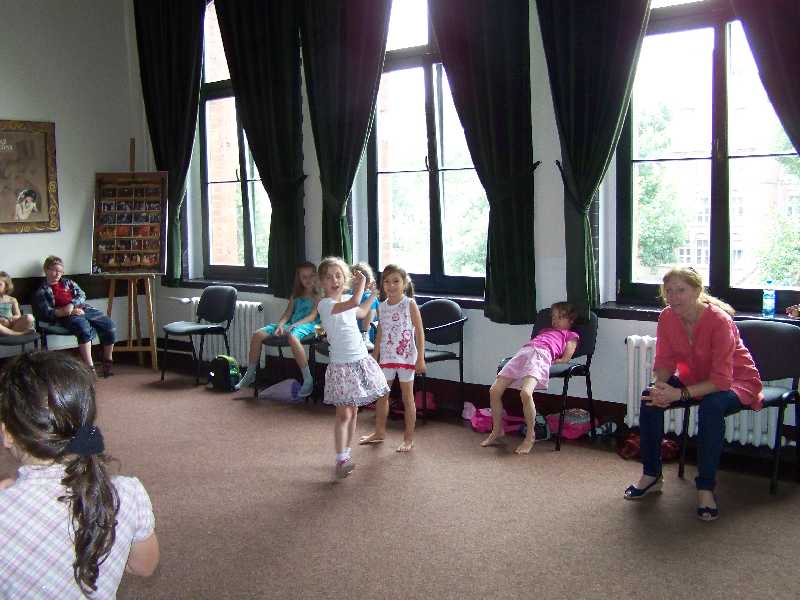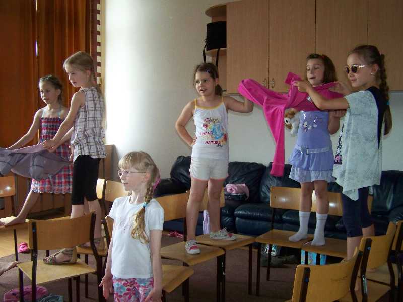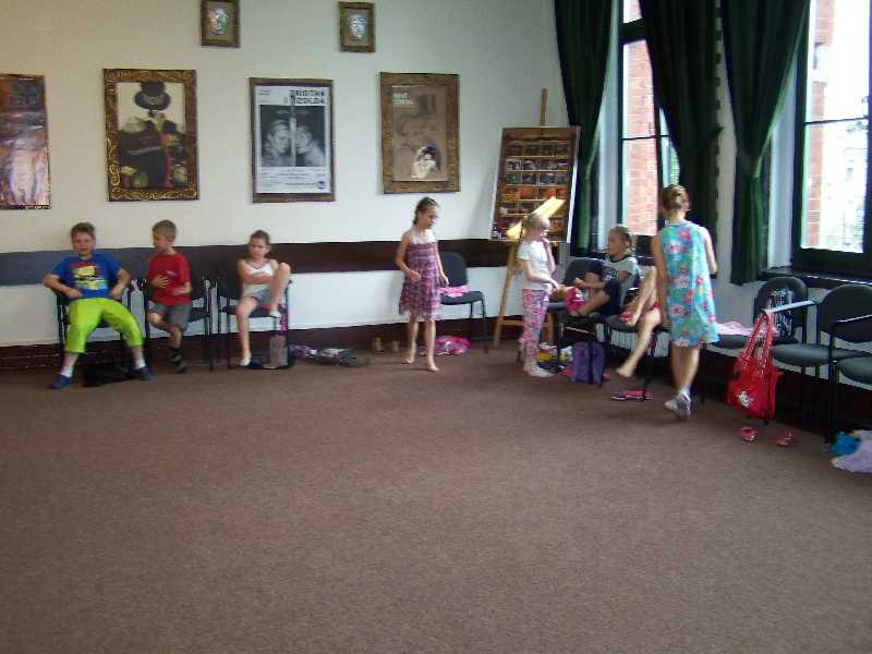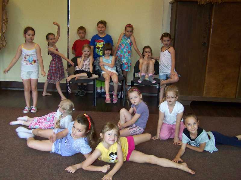 Ostatnie zajęcia teatralne to jeszcze jedna inscenizacja – tym razem piosenki „Na Wyspach Bergamutach” z „Akademii Pana Kleksa”. W grupie IV pani Iwona dodatkowo zorganizowała zabawę „Mam talent”. I tak zakończyła się półkolonijna przygoda z teatrem – szkoda, że była taka krótka…