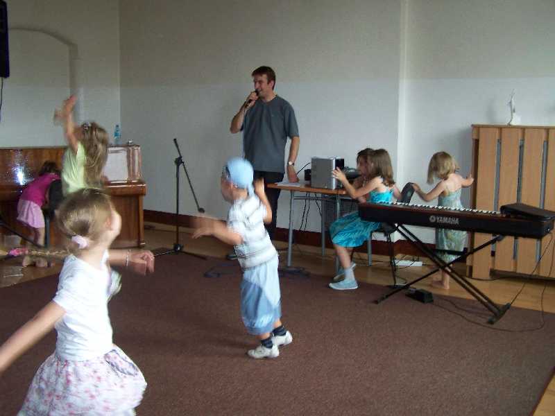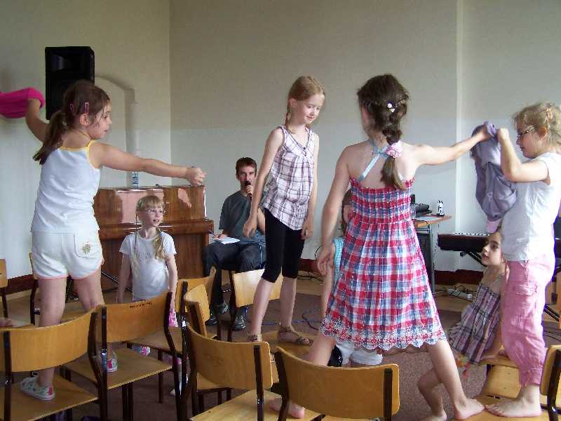 Najmłodsi miłośnicy śpiewania uczyli się dzisiaj sposobu zachowania na scenie. Bo wcale nie wystarczy na nią wejść i stać przed mikrofonem – wyglądałoby to raczej sztucznie. Pan Damian podpowiedział dzieciom, jak się poruszać i co robić, by występ sceniczny sprawiał wrażenie naturalnego i niewymuszonego. Na koniec półkoloniści popracowali jeszcze nad interpretacją piosenek poznanych na zajęciach.