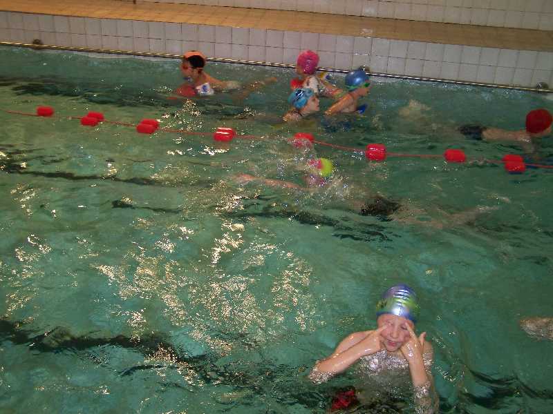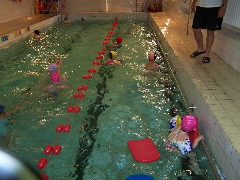 Zazwyczaj ostatnie zajęcia poświęcone są powtórzeniom i podsumowaniom – i nie inaczej było na basenie. Młodsza grupa doskonaliła technikę stylu grzbietowego, skakała do wody i nurkowała, natomiast starsza utrwalała pływanie żabką. A potem, jak co dzień, porcja gier i zabaw oraz sztafety pływackie na wesoło. Przy dzisiejszej dusznej i upalnej aurze pobyt na basenie to była sama przyjemność!