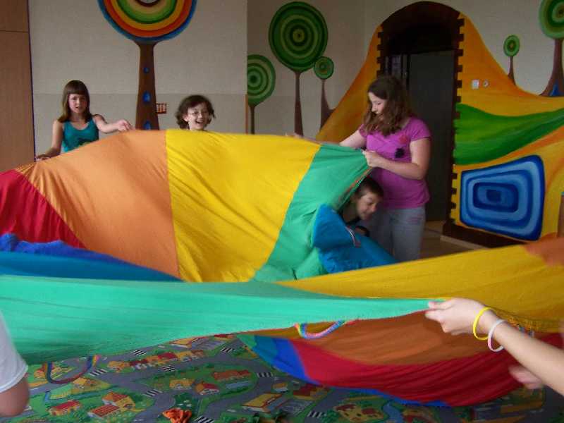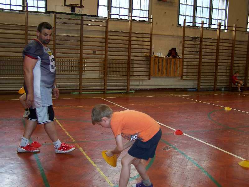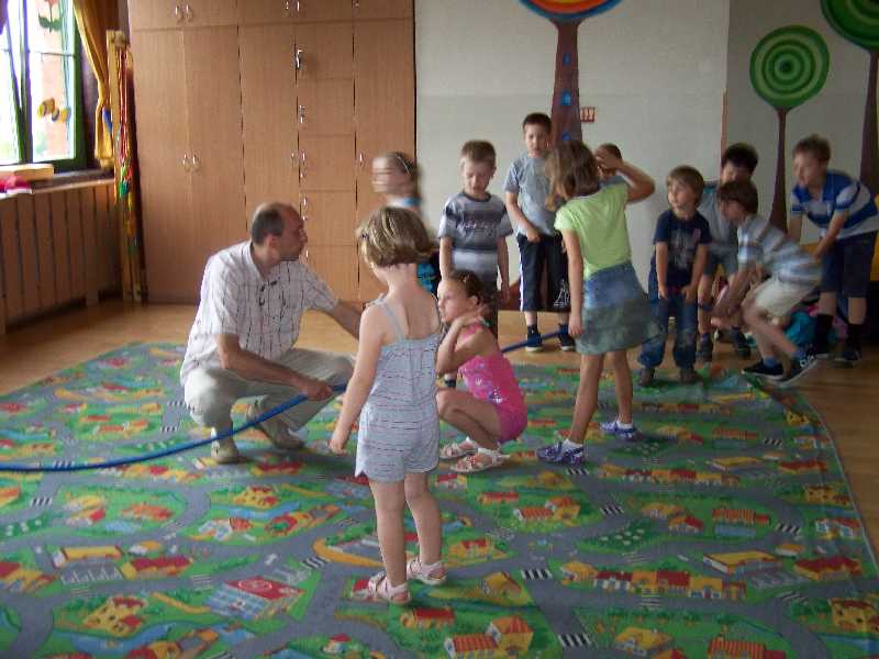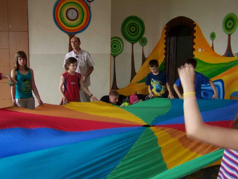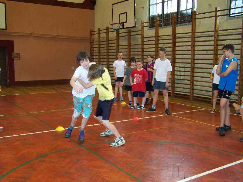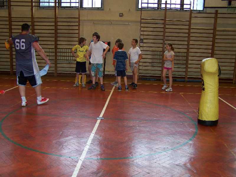 Dzisiaj pani Iga i pan Marcin postawili przed półkolonistami zadanie: każdy musiał wymyślić i przeprowadzić dwie własne zabawy przy muzyce. Można było przy tym wykorzystać każdy dostępny rodzaj sprzętu sportowego. Okazało się, że to wcale nie takie łatwe! Bo przecież trzeba najpierw opracować reguły, potem je wszystkim precyzyjnie objaśnić, a wreszcie czuwać nad prawidłowym przebiegiem zabawy. Poza tym wiele pomysłów nauczyciele dyskwalifikowali od razu na wstępie, ponieważ zapowiadały się zbyt niebezpiecznie. Tak więc ostatnie zajęcia okazały się chyba dla półkolonistów najbardziej wymagające – ale za to przyniosły im na pewno sporo satysfakcji.