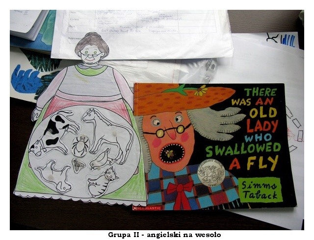 Na zajęciach z języka angielskiego dzieci wysłuchały książki o kobiecie, która połknęła muchę! Zabawna historia z równie zabawnym morałem była tematem dzisiejszego spotkania. Dzieci odegrały krótką inscenizację tej opowieści, potem powtórzyły nazwy zwierząt i kolorów a na koniec zajęły się rysowaniem i klejeniem.