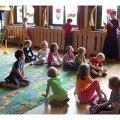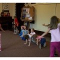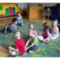 Jeśli chce się dobrze śpiewać, trzeba też kształtować słuch. Dlatego właśnie dzisiejsze zajęcia poświęcone były ćwiczeniu umiejętności słuchania – okazało się, że zwykłe, codzienne hałasy zza okna mogą być w tym całkiem pomocne! Najpierw należało się skupić, wyciszyć, a następnie usłyszeć i rozpoznać dochodzące z zewnątrz dźwięki. Po tak trudnym zadaniu nauka piosenki „Kaczka-Dziwaczka” oraz zabawy muzyczne przychodziły dzieciom z dużą łatwością.