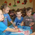 Następnie każda grupa wykonała pracę plastyczną. Dzieci wyklejały bibułą stroje dla świnek a także tworzyły dla nich domki z klocków, papieru i pudełek. Domki są piękne, kolorowe i bardzo trwałe!