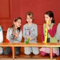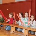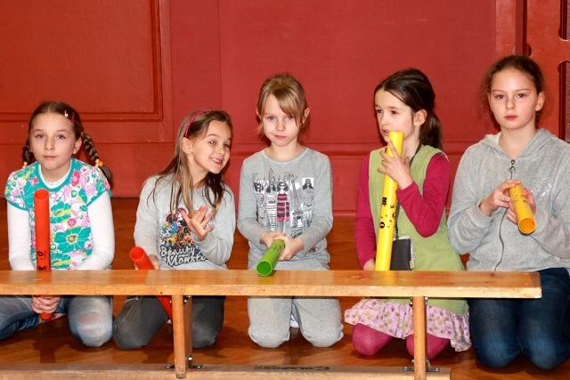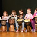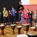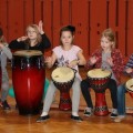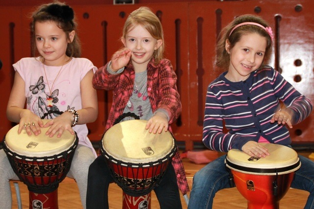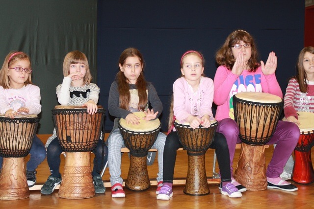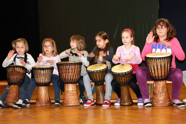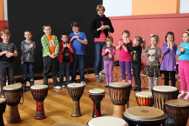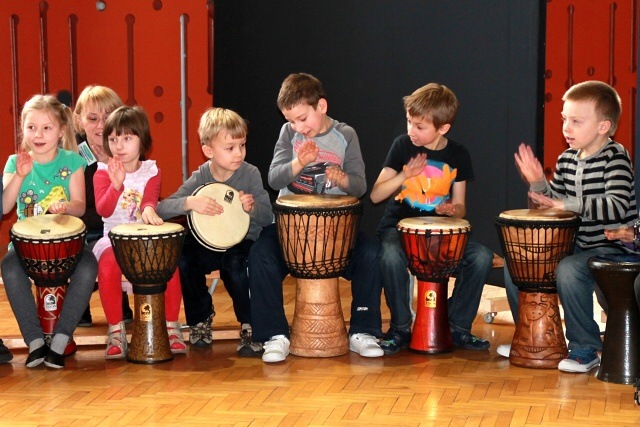 Krótkie ćwiczenia rytmiczne są przygotowaniem do gry na bębnach. Dzieci poznały budowę intrumentu djembe, naśladowały dzikie zwierzęta z afrykańskiej dżungli i grały na bębnach oraz grzechotkach. Za pomocą różnych dźwięków próbowały naśladować odgłosy natury, a na zakończenie odegrały wielki koncert ORKIESTRA BĘBNÓW.
