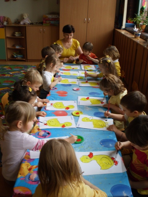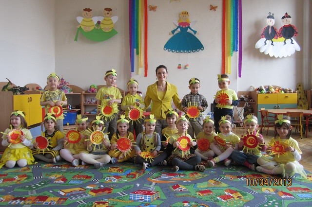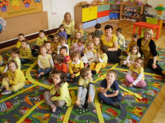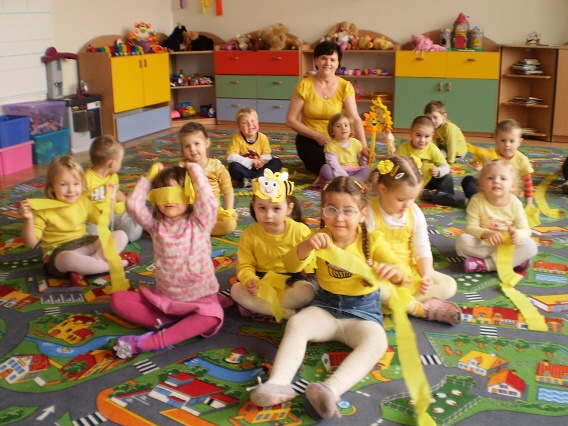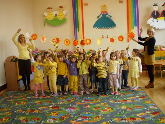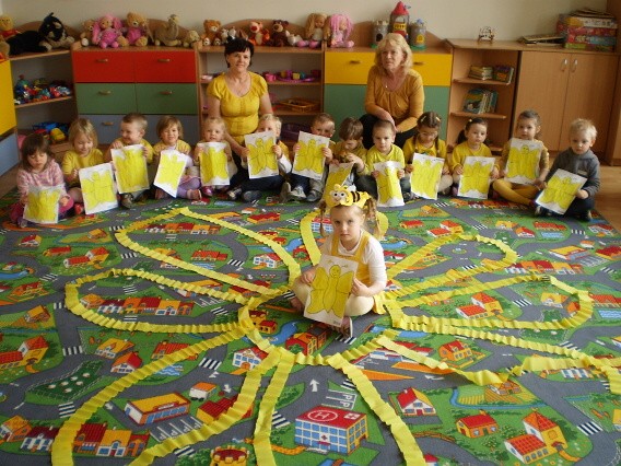 W środę, 10 kwietnia bawiliśmy się z kolorem żółtym. W tym dniu, wszystkie dzieci przyszły ubrane w kolorze słońca, który niesie w sobie ciepło i radość. Przedszkolaki uczestniczyły w zabawach kołowych, dyskotece z żółtymi wstążkami, rozwiązywały zagadki. Układały na dywanie z żółtych wstążek słoneczko i kwiaty. Następnie wszystkie grupy wykonały prace plastyczne – malowały kaczuszki, żółte motyle, wykonały pszczółki, słoneczka i tulipany. Ten dzień spędziliśmy w bardzo wesołej i wiosennej atmosferze.