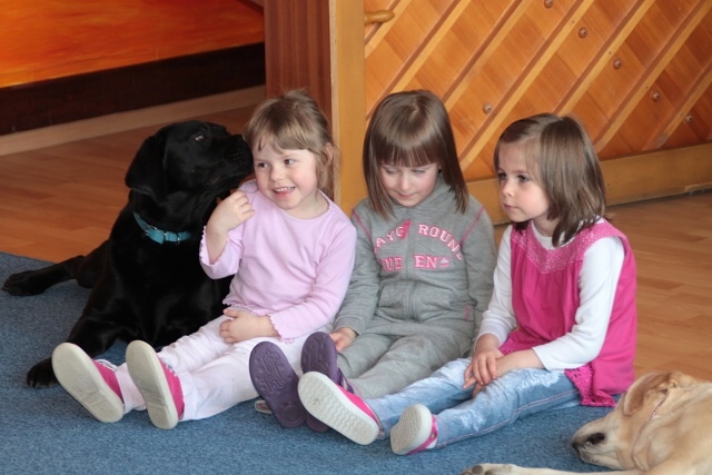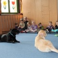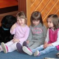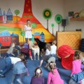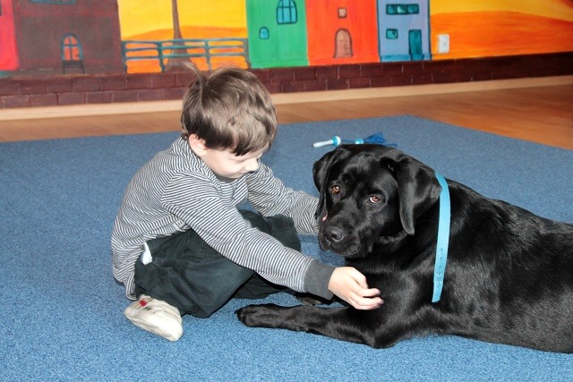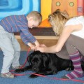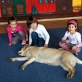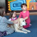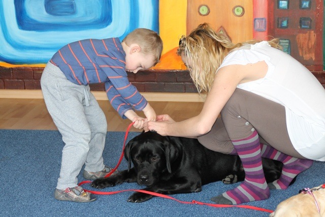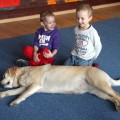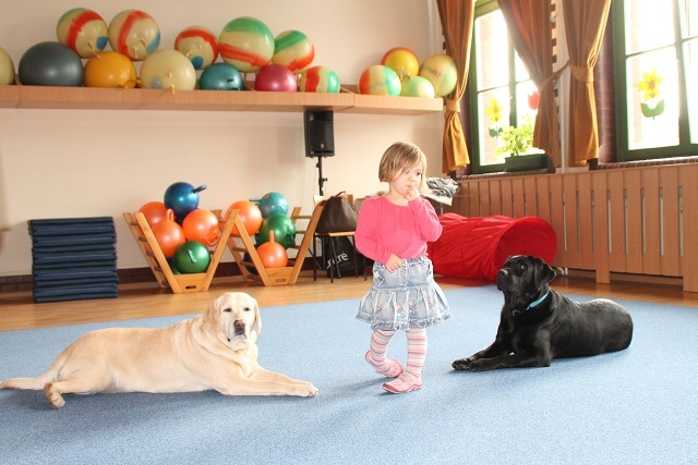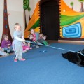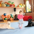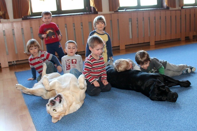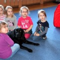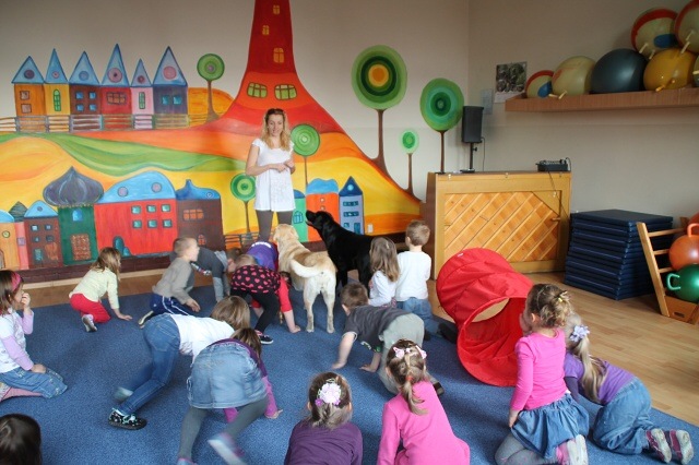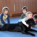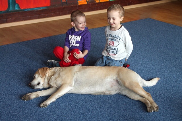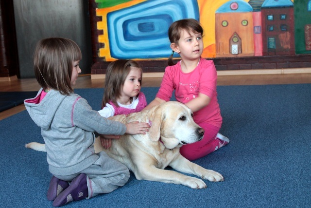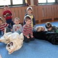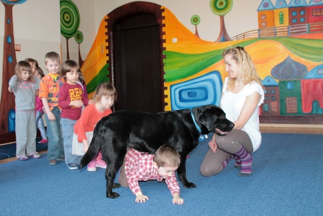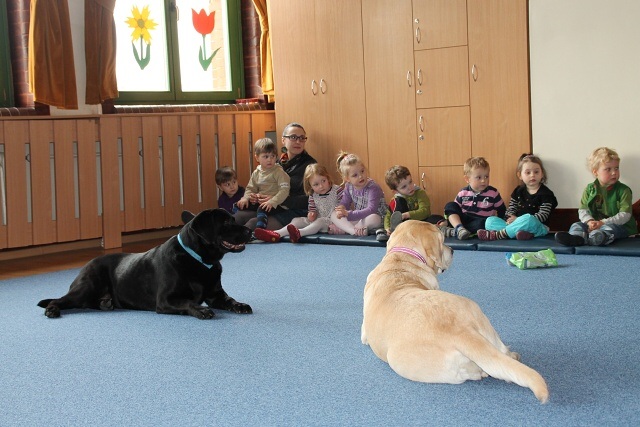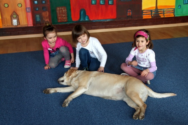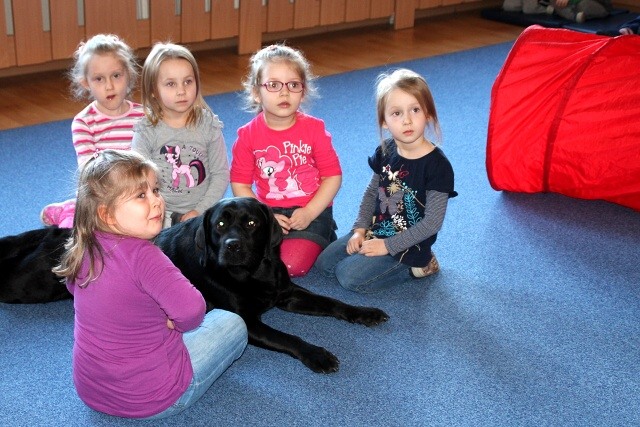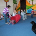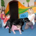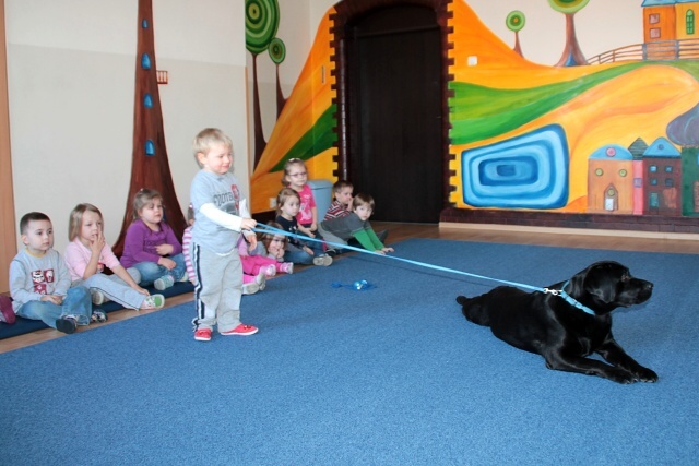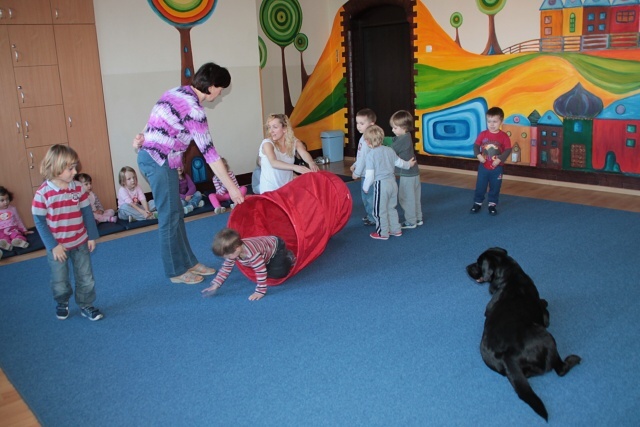 Labradory – Buba i Aura raz w miesiącu odwiedzają dzieci z pałacowej Akademii Edukacji Przedszkolaka. Spotkania z pieskami dają przedszkolakom wiele radości. W trakcie kwietniowych zajęć jak zwykle nie zabrakło zabawy połączonej z edukacją. Tym razem ciekawym elementem był tunel, przez który mogły przechodzić zarówno dzieci jak i pieski. Za oknem wiosna, więc każdy kto chciał, mógł wyprowadzić Bubę lub Aurę na mały spacer … po sali, uprzednio zapinając jej obrożę i smycz. W trakcie zabaw dzieci przypomniały sobie również co znaczą słowa: POD, NAD, OBOK, MIĘDZY. Już nikt nie boi się przejść POD i NAD pieskiem, a o tym jak bardzo dzieci zaprzyjaźniły się z czworonogami świadczą poniższe fotografie.
