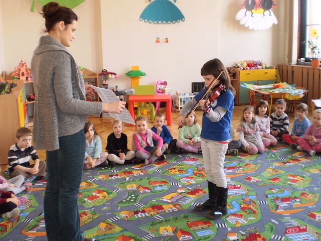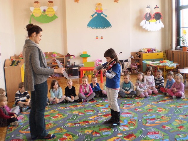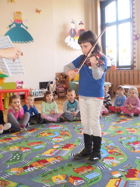 Grupę IV „Słoniki” odwiedził w środę bardzo miły gość. To nasza absolwentka Iva Grozev, obecnie uczennica drugiej klasy Państwowej Szkoły Muzycznej. Iva specjalnie dla dzieci z grupy IV zagrała piękny koncert na skrzypcach. Dzieci mogły obejrzeć i dotknąć skrzypiec, a także posłuchać ich wspaniałego dźwięku. Gratulujemy Ivie jej talentu i życzymy samych sukcesów!