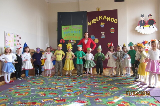 W środę 27 marca do grupy IV „Słoniki” licznie przybyli rodzice i zaproszenie goście, aby wspólnie świętować z okazji zbliżających się Świąt Wielkanocnych. Dzieci zaprezentowały przedstawienie słowno-muzyczne pt. „Cały świat pachnie wiosną”, które zostało przyjęte ogromnymi brawami. Następnie złożyliśmy rodzicom świąteczne życzenia w postaci wiersza i wręczyliśmy wielkanocne kurczaki, które dzieci wykonały samodzielnie na zajęciach plastycznych. Na koniec wszyscy wspólnie zatańczyliśmy wiosennego walczyka i zrobiliśmy pamiątkowe zdjęcie. Miło jest spotkać się w tak radosnej i rodzinnej atmosferze.