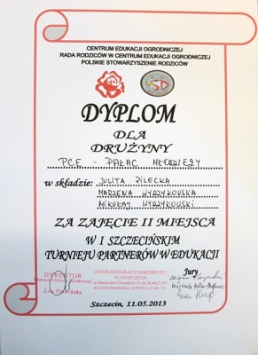 Drużyna Pałacu Młodzieży zdobyła II miejsce i Puchar Polskiego Stowarzyszenia Rodziców w Turnieju, który odbył się 11 maja w Centrum Edukacji Ogrodniczej w Szczecinie. Uczestnikami Turnieju były trzyosobowe drużyny szkół i placówek w składzie: rodzic-uczeń–nauczyciel. Pałacową drużynę tworzyli: Julita Pilecka, Marzena Wyrzykowska oraz Mikołaj Wyrzykowski.