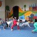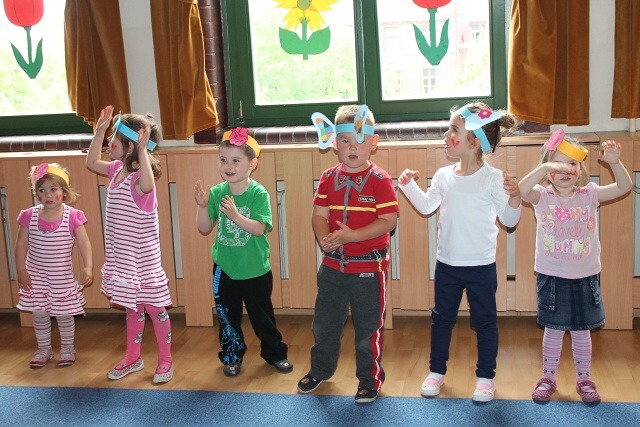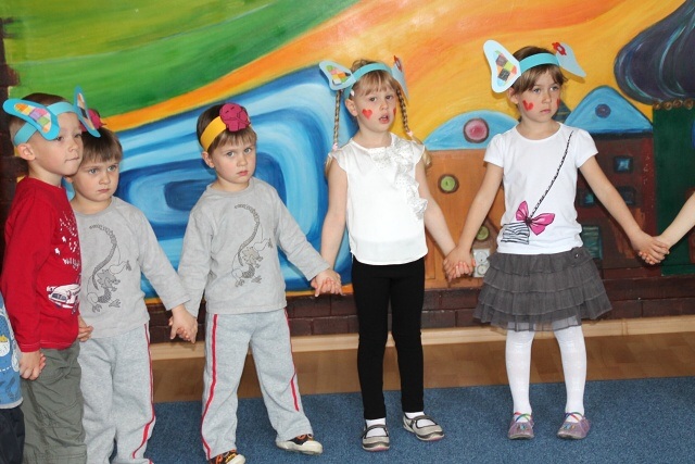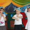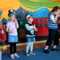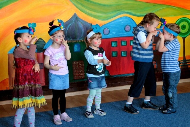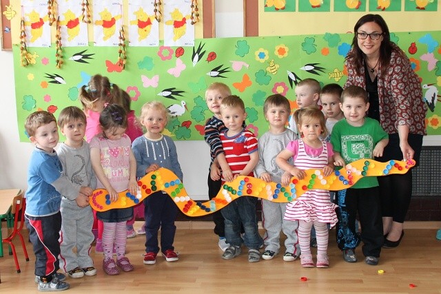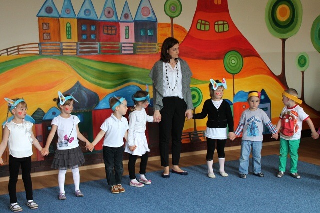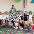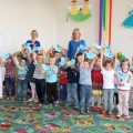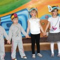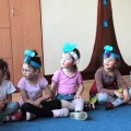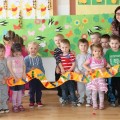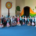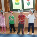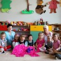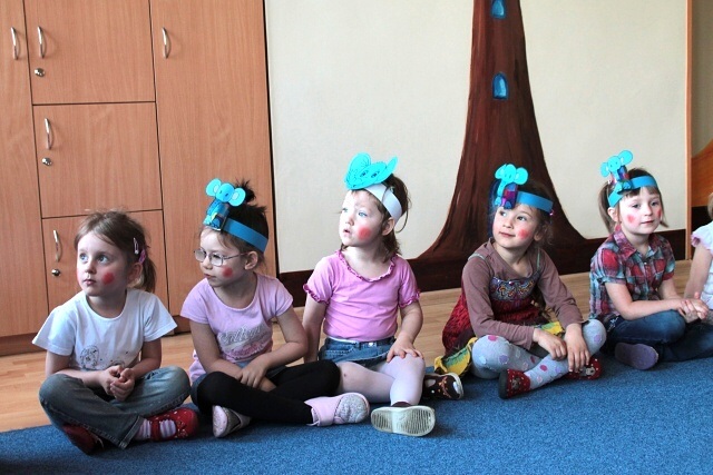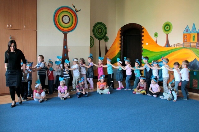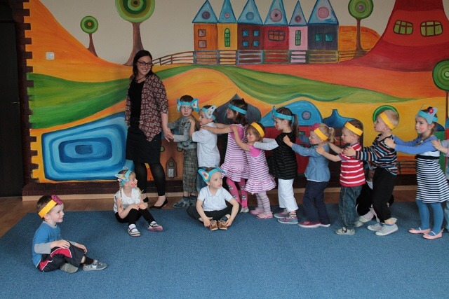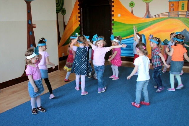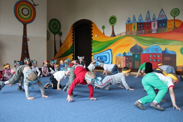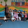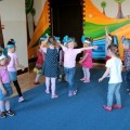 Następnie w sali rytmicznej odbyły się zabawy i konkursy związane z przeczytaną historią. Dzieci bawiły się w węża i dzikie zwierzęta, które mieszkają w dżungli, tam gdzie słoń Elmer. Było dużo tańca, piosenek a także nauki o tym, że nie należy odłączać się od stada – tego rodzinnego!