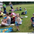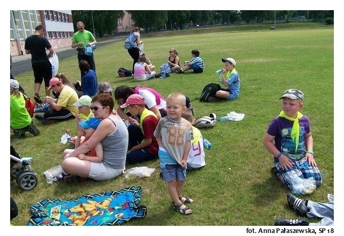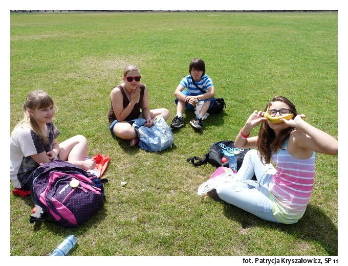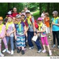 Otrzymaliśmy również posiłek turystyczny. Część z nas leniuchowała na trawie, część brała udział w konkursach krajoznawczych i sportowych, w których można było wygrać nagrody. Następnie pożegnaliśmy się z Panią Elą Wielgoszewską, która przez te wszystkie rajdy oprowadzała nas po okolicznych szlakach. To dzięki niej tak chętnie i licznie wędrujemy, bez względu na pogodę (nie straszny nam mróz, ni deszcz, ni skwar:-) ).