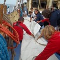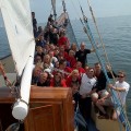 Po wypłynięciu z Aarchus i serdecznym pożegnaniu przez mieszkańców miasta i asystujące jednostki pływające pożeglowaliśmy na linię startu na pełnym morzu, która wyznaczona została przez dwie jednostki pomocnicze. Wcześniej jednak przepłynęliśmy pod mostem zawieszonym 55 metrów nad wodą, majestatycznie łączącym Danię i Szwecję na wysokości Kopenhagi. Start odbył się osobno dla każdej kategorii żaglowców – najpierw wyruszyły te największe, później, po pół godzinie jachty klasy B – wśród nich nasz „Kapitan Burchardt”, po 15 minutach kolejne klasy. Start żaglowców nie był spektakularny, gdyż przewrotny Neptun poskąpił wiatru i wszystkie żaglowce stały w miejscu przy zupełnej flaucie. Dopiero wieczorem pierwsze powiewy ruszyły nas z miejsca. Siła wiatru wzmagała się coraz bardziej, aż doszła do 7 – 8 w skali bouforta. Wachty pełnione były z coraz większą trudnością, wielu z nas poddało się chorobie morskiej która odebrała siłę i chęci do aktywnego udziału w zadaniach, jednak ci z nas, którzy oparli się przykrym dolegliwościom, dzielnie zastępowali i wspierali pozostałą załogę. Po ciężkiej nocy dotarła do nas przykra wiadomość: 11 lipca, z nieznanych przyczyn, ponad 100 letni żaglowiec Wywern zaczął iść na dno przy południowym wybrzeżu Gotlandii. 10-osobowa załoga szybko została uratowana i helikopterem odwieziona na brzeg. Kilka godzin później na pokład tonącego statku weszło 3 członków załogi żaglowca Wilde Swan – także biorącego udział w regatach Tall Ship Races, jednak przechylona jednostka poszła pod wodę. Wraz z nią zatonął jeden z żeglarzy, który jak mówią świadkowie zaplątał się w liny. Pozostałą dwójkę uratowała załoga szwedzkiej łodzi ratunkowej.