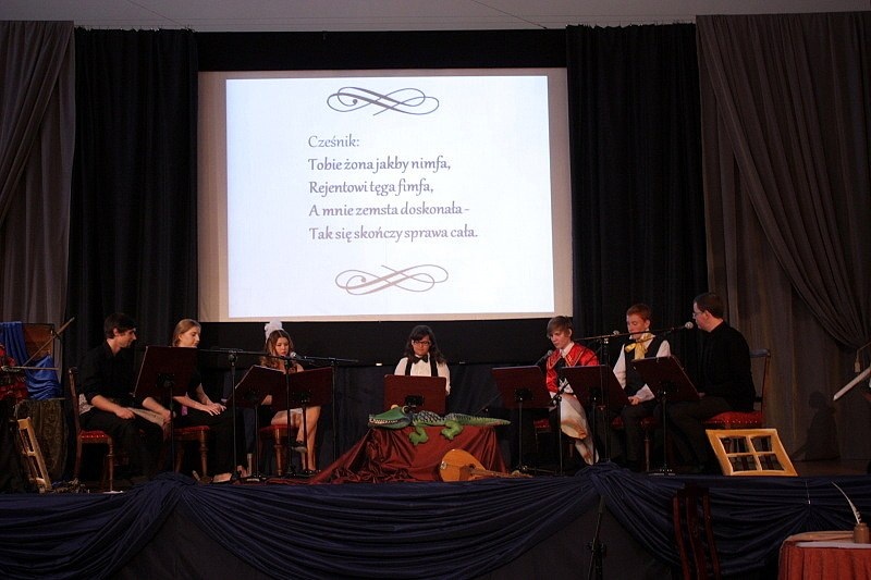 Wspólne odczytanie przez wszystkich zgromadzonych krótkiej bajki „Osiołkowi w żłoby dano”, przypomniało nam, że Fredro był również znanym bajkopisarzem. Znaleźli się również chętni do samodzielnego zaprezentowania tekstów. Wśród nich była Małgorzata Pokorska – dyrektor Pałacu Młodzieży.