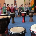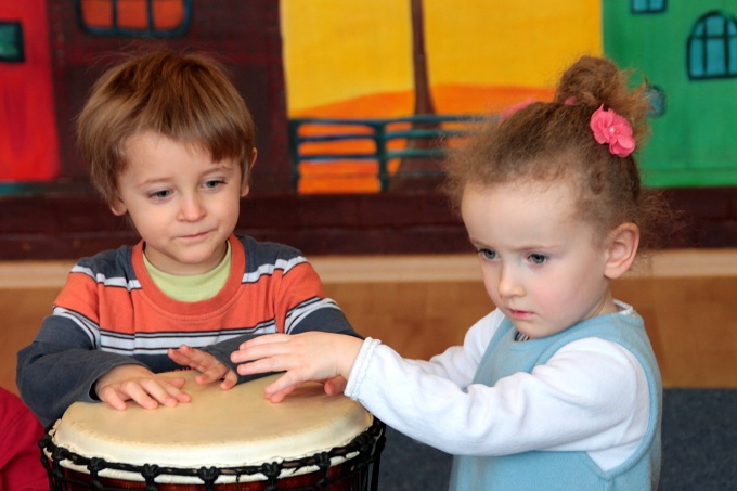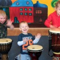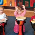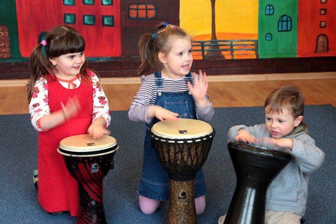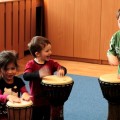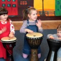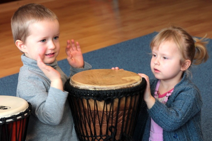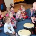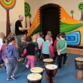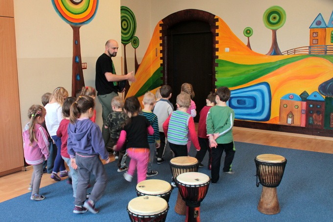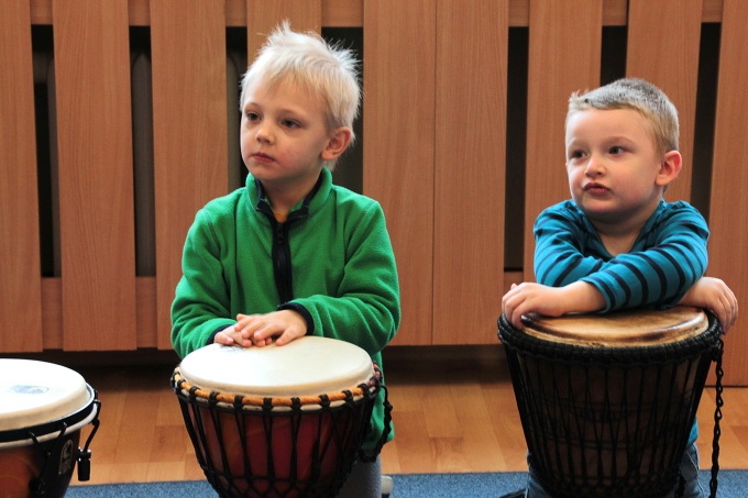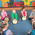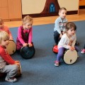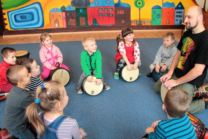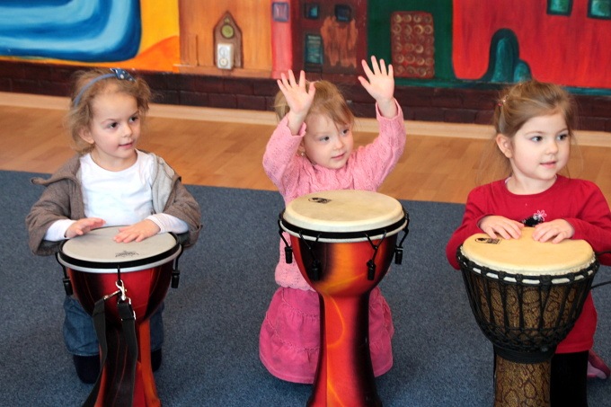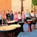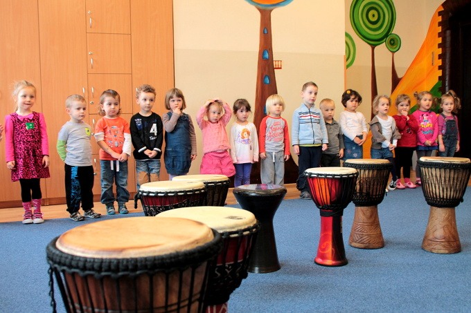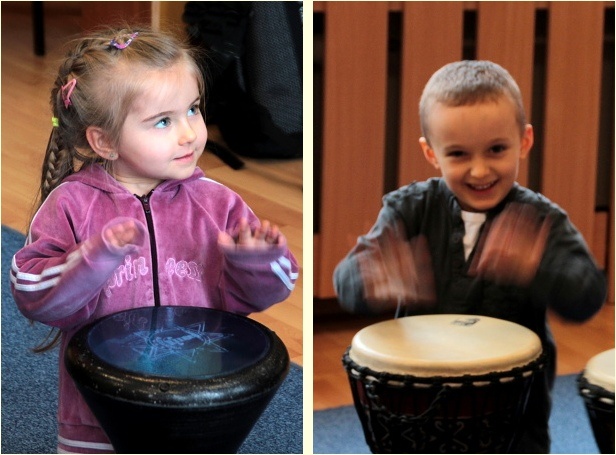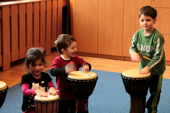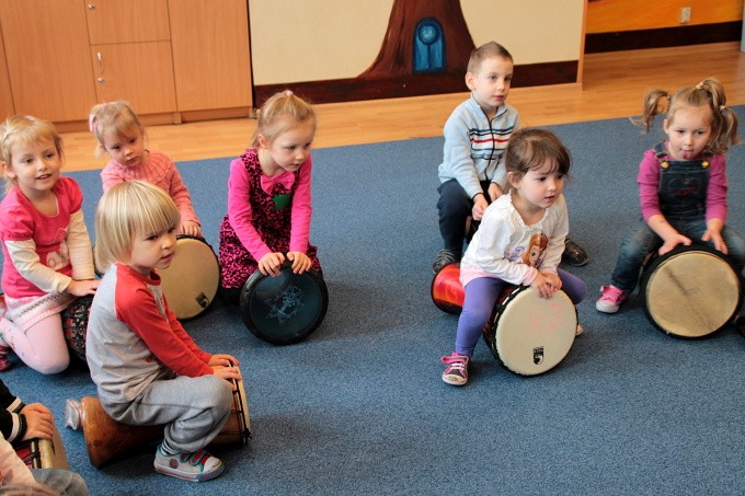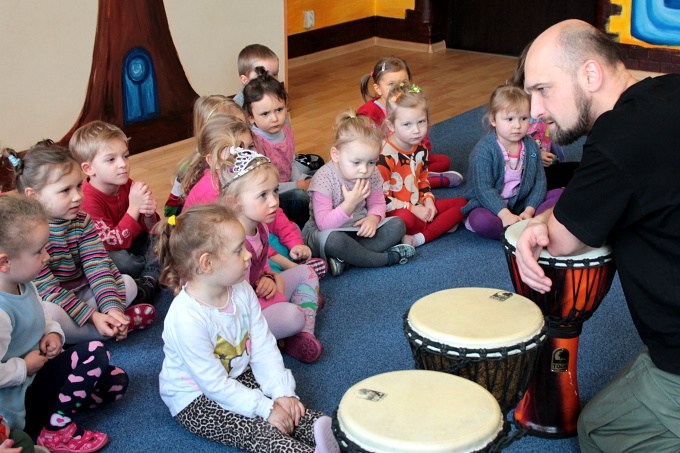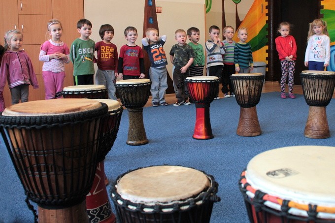 Podczas kolejnego spotkania z muzyką etniczną, pałacowe przedszkolaki wyruszyły na rytmiczną wyprawę do Krainy Wielkich Jezior. Tam poznawały rytm wody i uczyły się rozpoznawania dźwięków niskich i wysokich. Oczywiście w trakcie zajęć rytmiczno – tanecznych nie zabrakło żywiołowej i pełnej energi gry na bębnach djembe. To przedszkolaki lubią najbardziej!