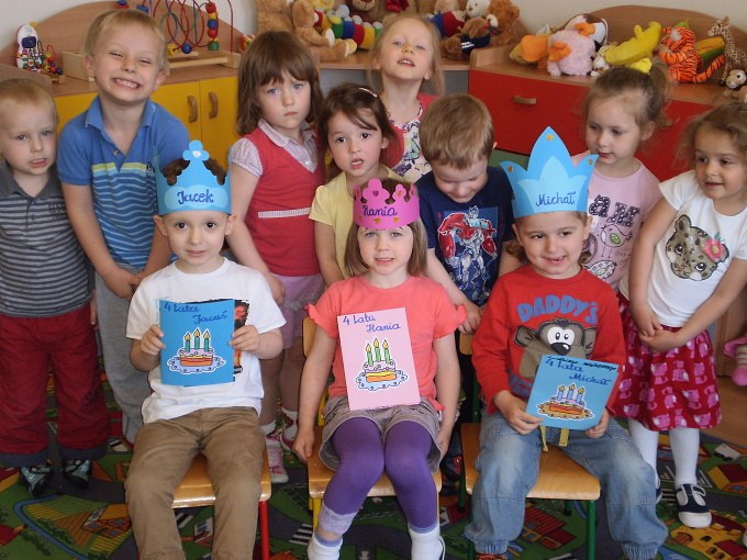 W kwietniu swoje święto obchodzili: w gr. I – Jacek, Michał i Hania, w gr. II – Julia a w gr. III – Krzysiu. Ten dzień jest bardzo szczególny dla naszych jubilatów, ponieważ właśnie w tym dniu zostają Królami i cały dzień noszą korony. Są też wspólne pląsy i zabawa przy muzyce. Oczywiście dla wszystkich dzieci jest słodki poczęstunek, który przygotowują rodzice jubilatów. Wszystkiego najlepszego!