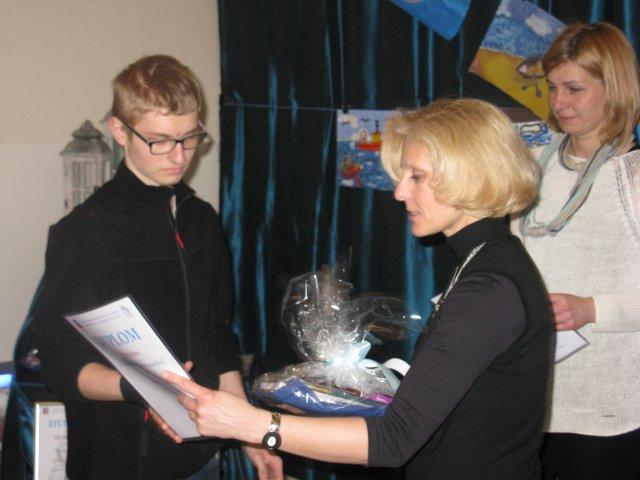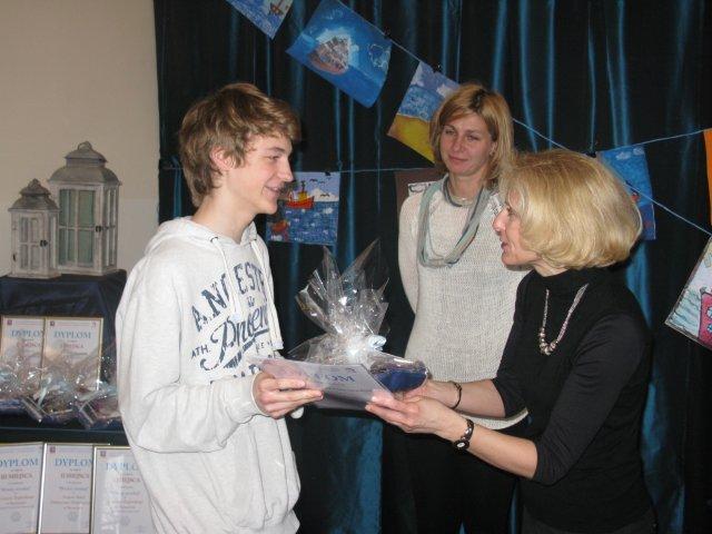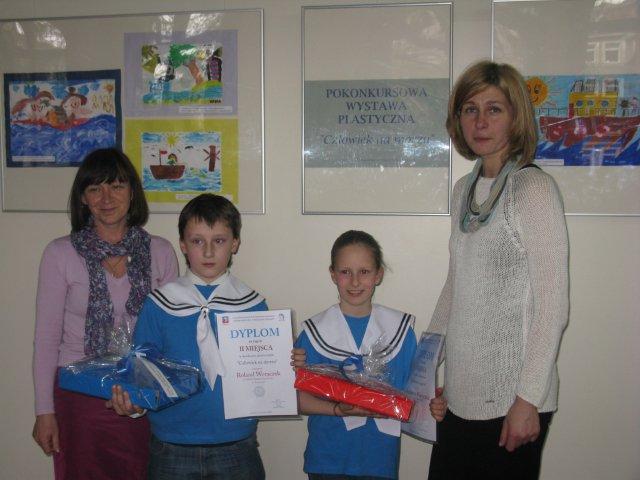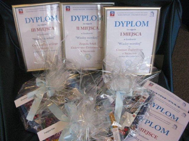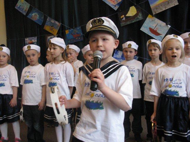 10 kwietnia br. w Pałacu Młodzieży odbyło się wręczenie nagród w konkursie „Wiedzy Morskiej” oraz konkursie plastycznym „Człowiek na Morzu”. Miłym akcentem rozpoczynającym uroczystość był występ dzieci z Przedszkola Publicznego Nr 65, które w stroje marynarskich zaśpiewały dla nas szanty Wacka Jefimowicza. Uroczystego wręczenia nagród dokonała p. Katarzyna Lubińska, wicedyrektor Pałacu Młodzieży. W „Wiedzy morskiej” najlepszym w kategorii indywidualnej jest Michał Król z CŻ oraz Piotr Nycz z ZSEE, a w kategorii drużynowej jest Gimnazjum Nr 6 i Centrum Żeglarskie.