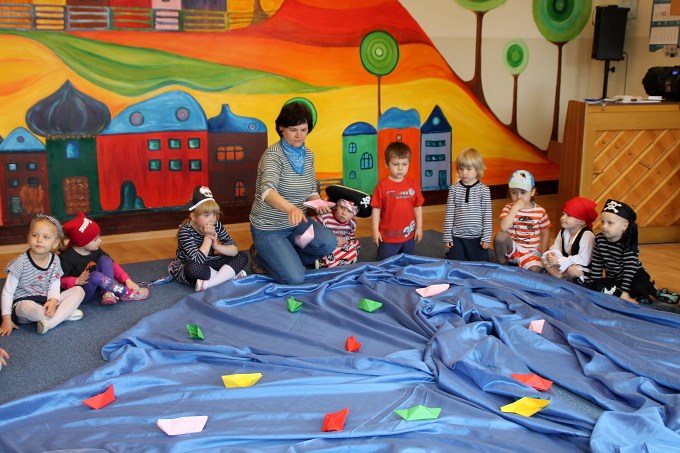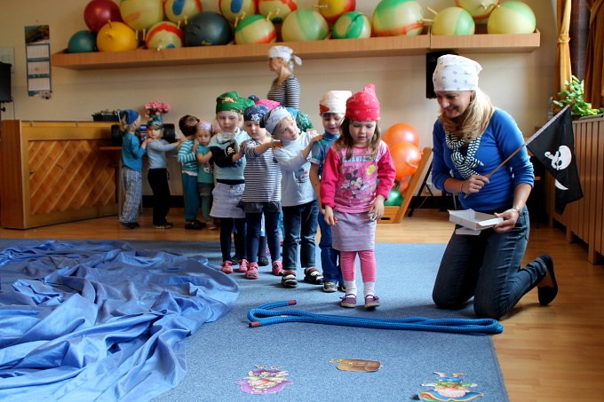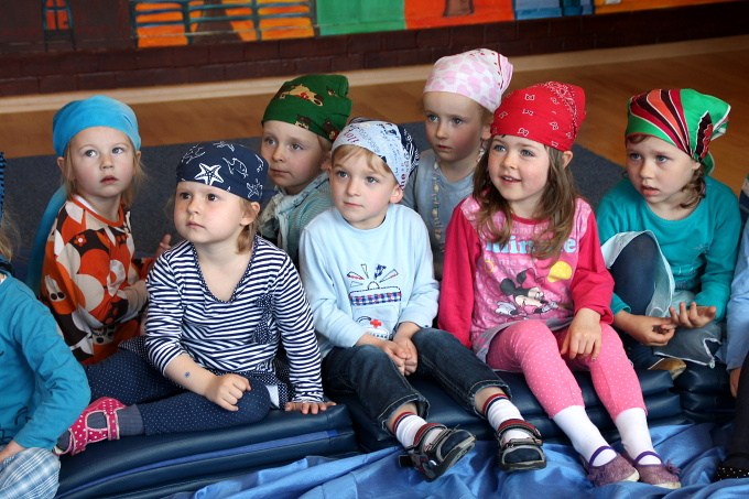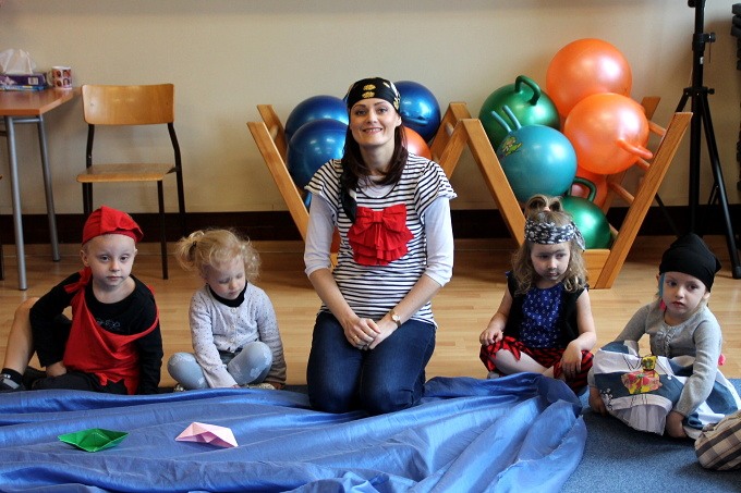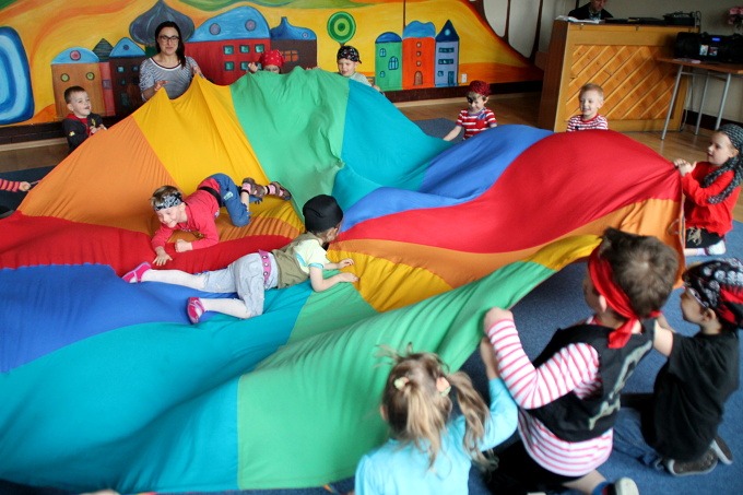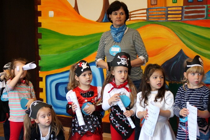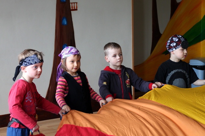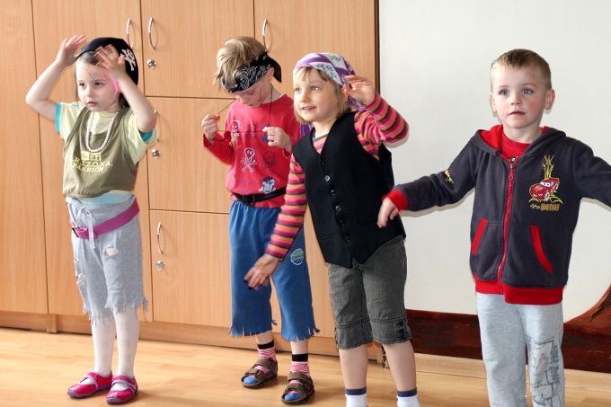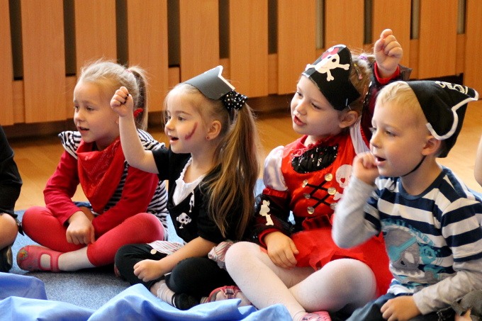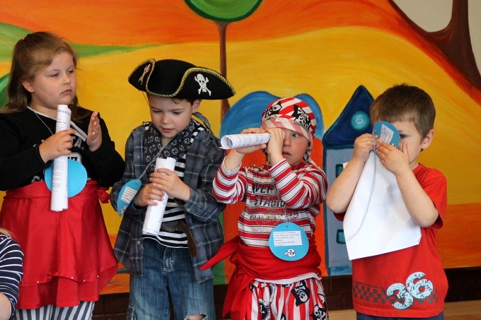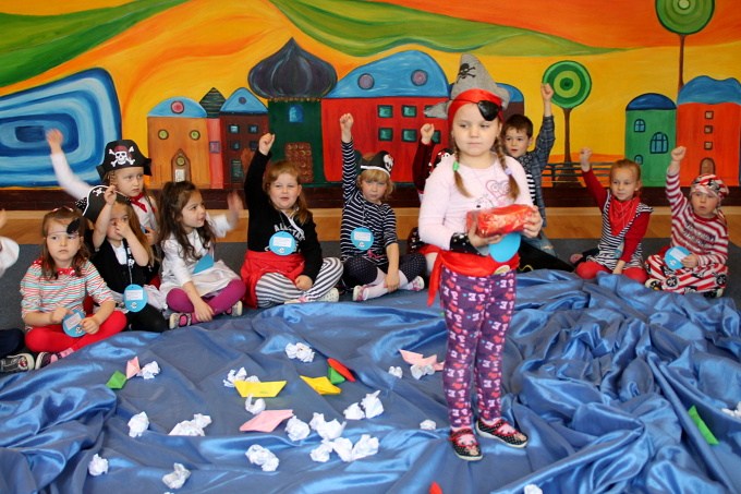 14 maja wypłynęliśmy z naszymi przedszkolakami na szerokie wody oceanu podczas DNIA PIRATA. Motylki i Kangurki w pięknych pirackich strojach bawiły się wspólnie przy skocznej muzyce i rysowały dzielnego pirata. W nagrodę za wesołą zabawę otrzymały „Medal Pirata”. Misiaczki i Słoniki również przybyły do Akademii przebrane w kolorowe stroje. Czas upłynął nam na zabawie twórczej do muzyki z płyty „Pippi Piratka”, zabawach z chustą Klanzy, łowieniu ryb oraz pracy plastycznej „Morska Kraina”. Nagrodą za wspaniałą zabawę była moneta z odnalezionego pirackiego skarbu.