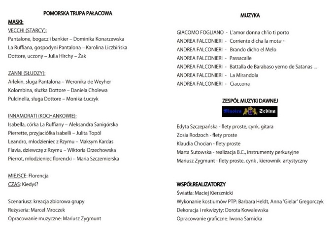 Wystąpili: Pomorska Trupa Pałacowa /Pracownia Teatralna, op. art. Marcel Mroczek/ oraz Zespół Muzyki Dawnej MUSICA SEDINA /op. art. Mariusz Zygmunt/.