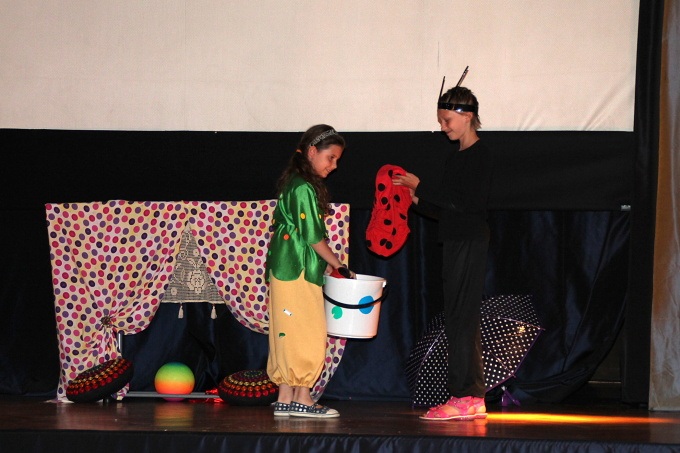 Przedstawienie było opowieścią o Kropkowej Krainie. Zamieszkiwał ją pewien skrzat, który gdzie tylko się pojawił, zaraz kropki rozdawał… Sypał je garściami na wszystkich, których napotkał….
