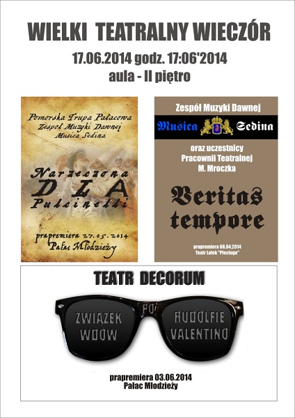 - 17:45 – „Veritas tempore” – spektakl pantomimiczny uczestników Pracowni Teatralnej do muzyki granej przez Zespół Muzyki Dawnej MUSICA SEDINA
