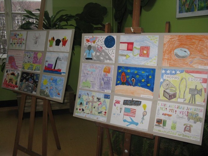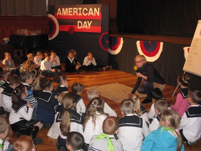Jak zawsze, rozpoczęliśmy od wykładu na temat historii i geografii USA. Dzieci dowiedziały się wielu rzeczy o powstaniu Stanów Zjednoczonych, przyłączaniu kolejnych terytoriów, wojnach z Indianami, wojnie secesyjnej, a także o innych ciekawych faktach historycznych. Pani Renata Fabiańska-Grzybowska opowiedziała również o amerykańskiej fladze i godle i wyjaśniła, jaką rolę odgrywają w nich poszczególne symbole.