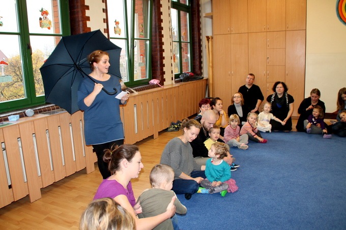 13 listopada zaprosiliśmy rodziców dzieci z grupy MOTYLKI, do wspólnej zabawy przy dźwiękach jesiennych piosenek: „Pada deszcz”, „Posypały się listeczki”, „Taniec krasnoludków”. Dzieci wysłuchały też wiersza pt. Jesienny deszczyk” i wspólnie z rodzicami bawiły się chustą animacyjną oraz gazetami naśladując jesienną pogodę. Na koniec wspólnie wykonaliśmy pracę plastyczną pt. „Jesienne parasole”.