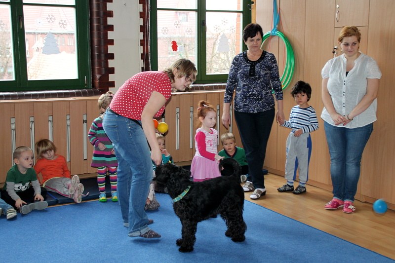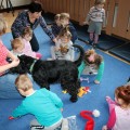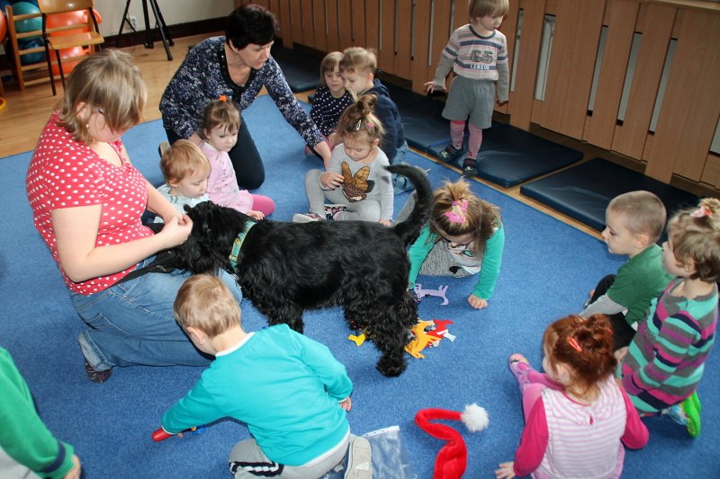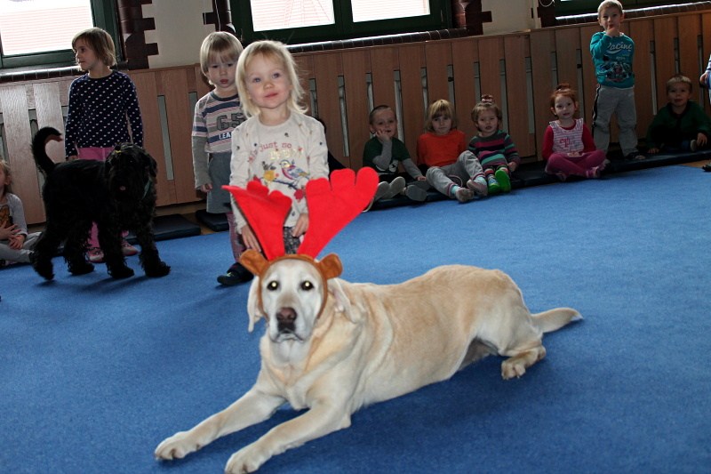 Buba, Aura i ich kolega przybyli do naszych przedszkolaków 16 grudnia w prawdziwie świątecznych nastrojach. Aura chętnie przystała na ozdobę w postaci rogów renifera i wraz z Bubą obserwowała leniwie zabawy dzieci. Tego dnia bohaterem spotkania był czarny sznaucer Kokos, który chętnie aportował i bawił się z naszymi 3-latkami. A Buba i Aura tego dnia tworzyły głównie świąteczny nastrój 🙂