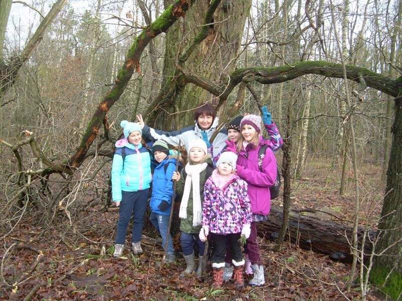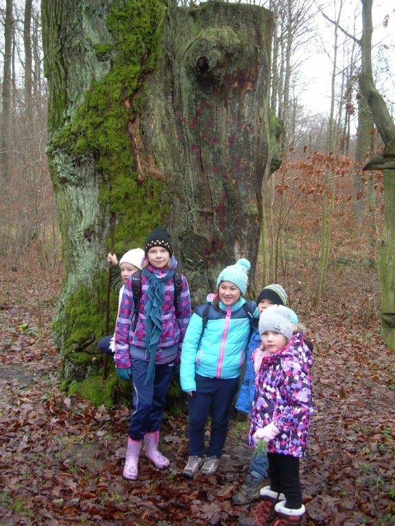 Wędrówkę rozpoczęliśmy z pętli autobusowej Podbórz. Zatrzymaliśmy się na chwilę przy Pomniku Sportowców, a następnie udaliśmy się w kierunku Dębu Bogusława X, gdzie zrobiliśmy krótką przerwę na wysłuchanie ciekawostek, którymi dzieliła się z nami pani Ela oraz szybki turystyczny posiłek.