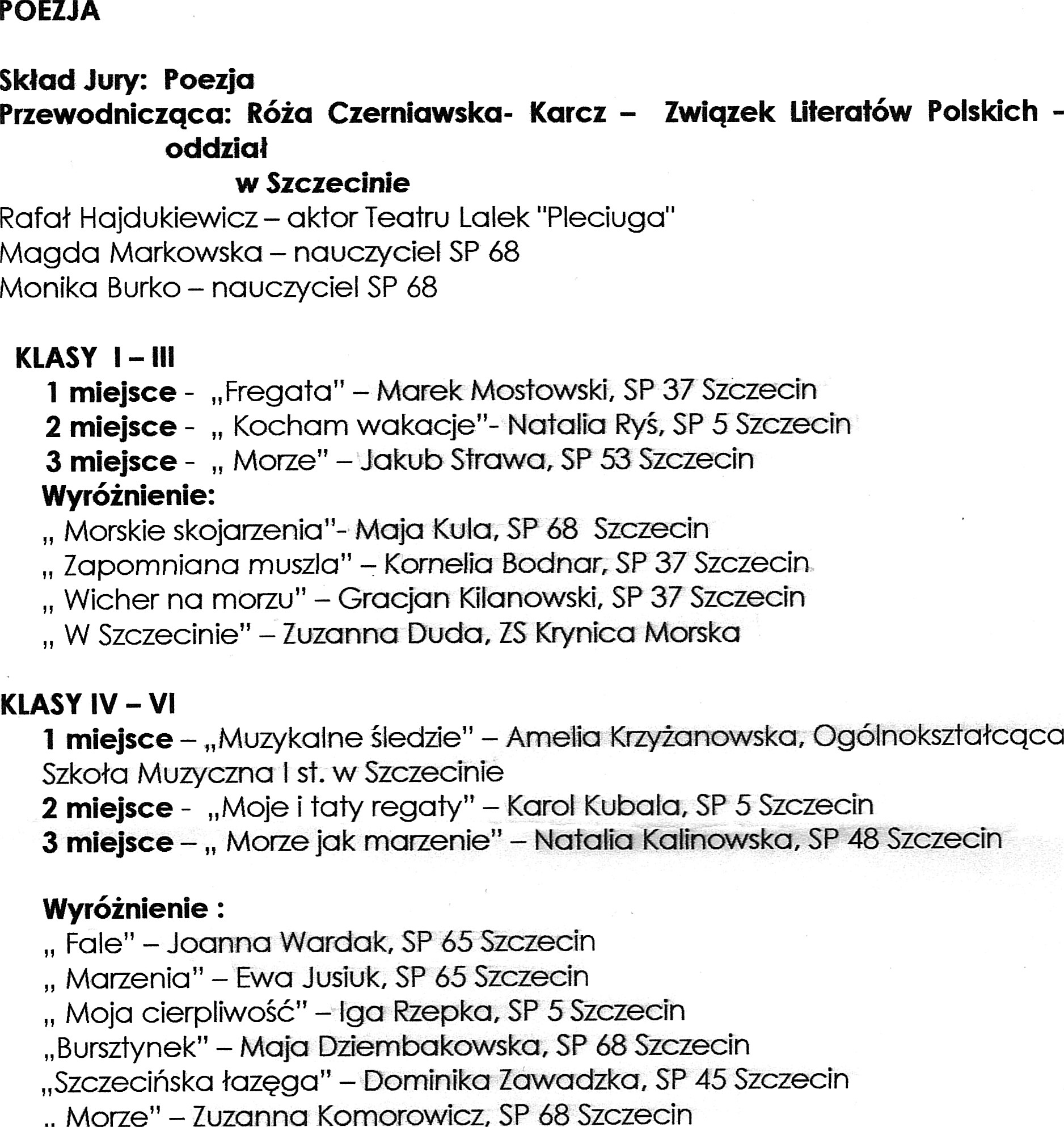 Oto jeden z wielu wierszy nadesłanych na konkurs, którego rozstrzygnięcie odbyło się w Zachodniopomorskim Urzędzie Wojewódzkim w Sali Rycerskiej, przy udziale przedstawicieli władz Miasta i Województwa, Kuratorium Oświaty, Akademii Morskiej oraz licznie przybyłych gości.