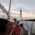Stoimy w Gdyni. Na cały Bałtyk ostrzeżenie o sztormie. Czekamy. Planowaliśmy odwiedzenie innych portów, ale przy tej pogodzie? Z prognozy wynika, że w rejonie naszej żeglugi wiatr na jakiś czas zelżeje. Narada z Jurkiem Szwochem kapitanem S/y Dar Szczecina, decydujemy się na przelot do Kłajpedy. Może zdążymy przed kolejnym sztormem? Na żaglach i silniku opływamy wody rosyjskie. Po dobie żeglugi wpadamy do Kłajpedy i cumujemy na rzece Danie. Zostaliśmy mile przyjęci przez organizatorów. A na morzu 8-9°B. Nawet w porcie jachty kołyszą się na cumach. Wraz z załogą Dara zwiedzamy Kłajpedę. Jej historię w Muzeum Historycznym Miasta, muzeum bursztynu i urokliwą starówkę. Czekamy na przybycie liaison-ów.
