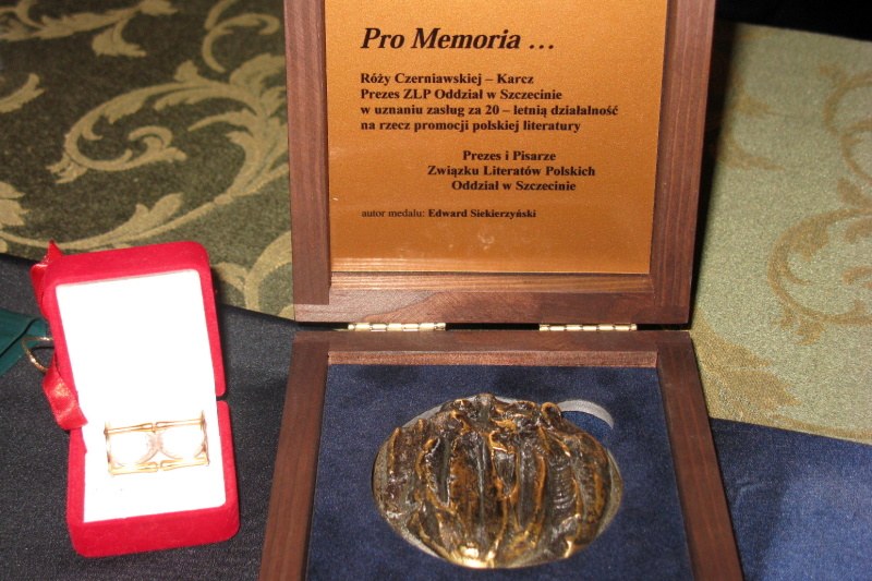 W trakcie wieczoru Poetka i kończąca swą kadencję Prezes szczecińskiego ZLP, otrzymała medal z rąk swojego następcy, obecnego Prezesa Leszka Dembka. Medal wręczono w uznaniu zasług za 20-letnią działalność na rzecz promocji polskiej literatury. Wieczór zakończyły jak zwykle rozmowy o poezji i nie tylko….
