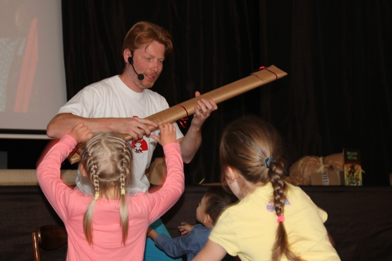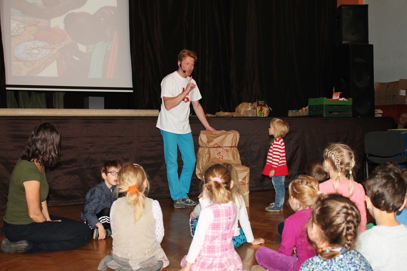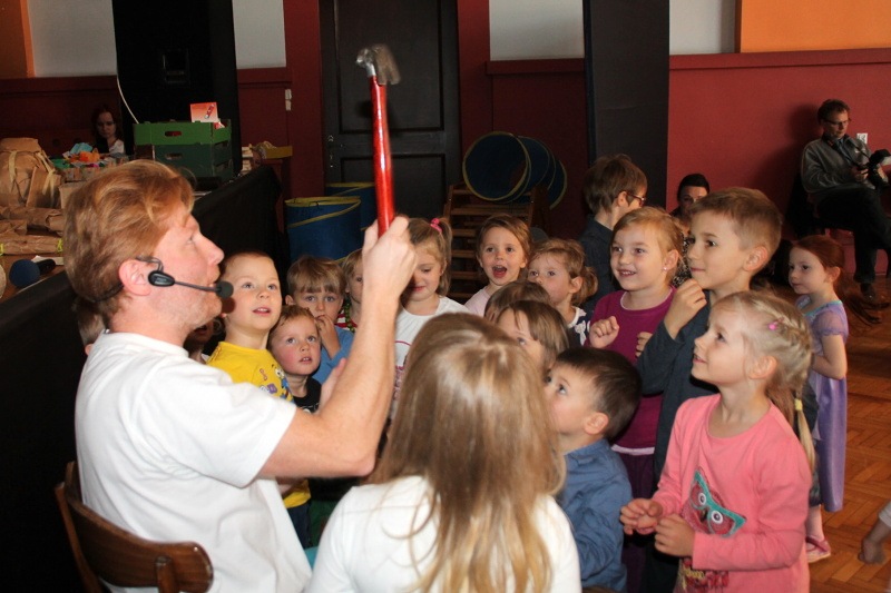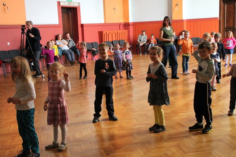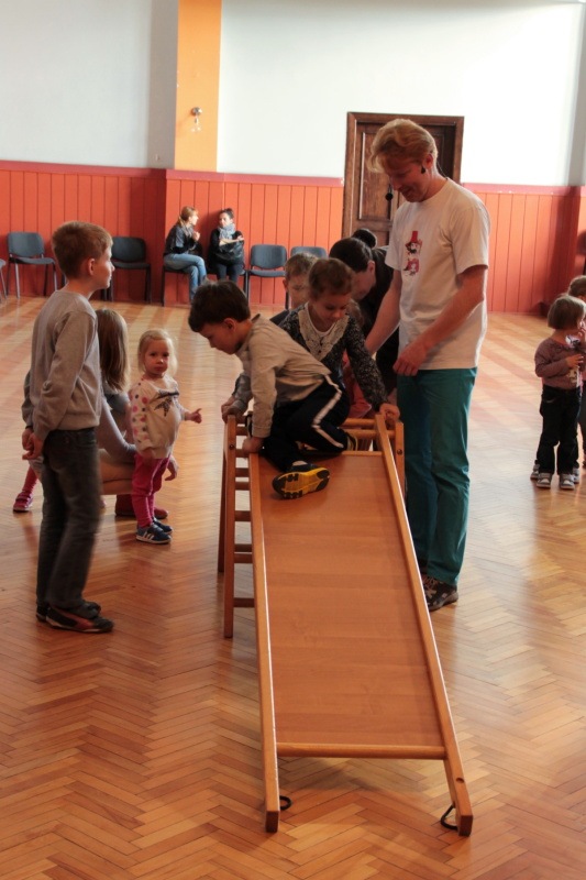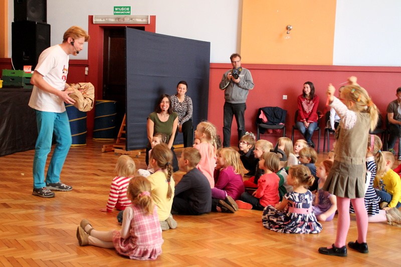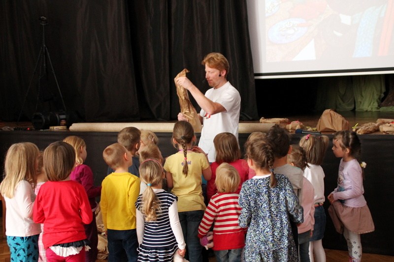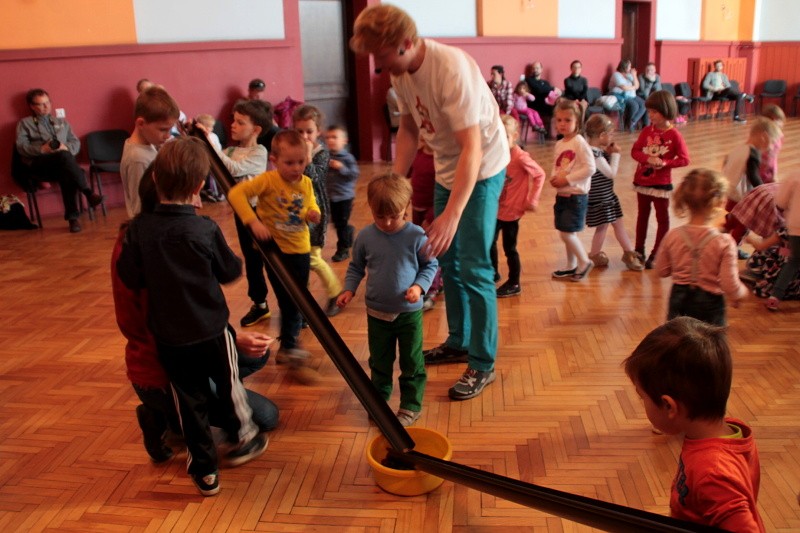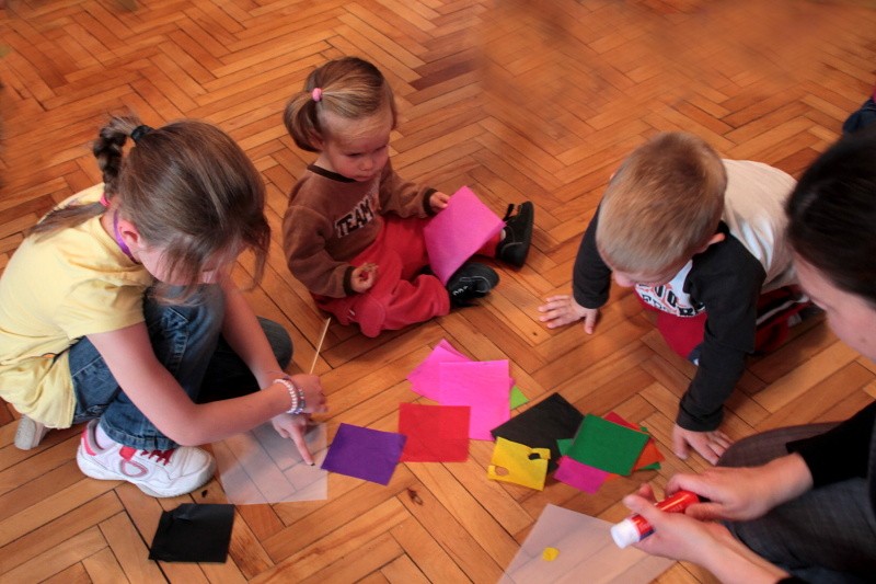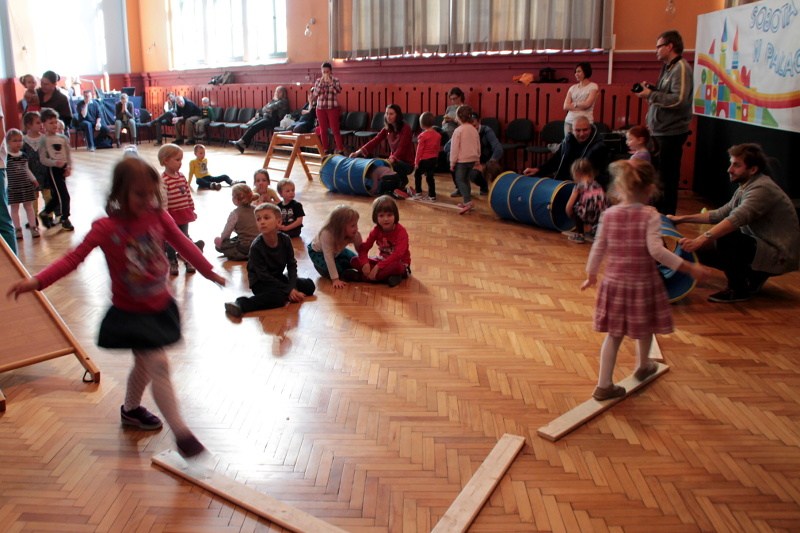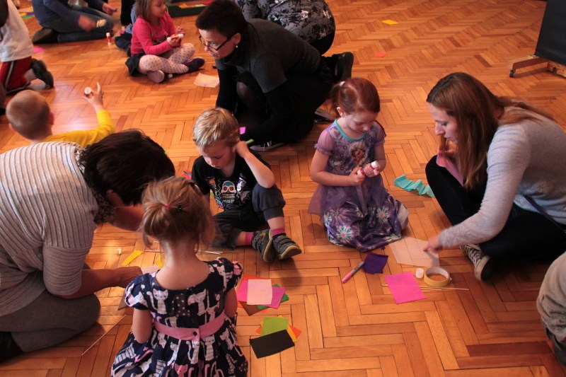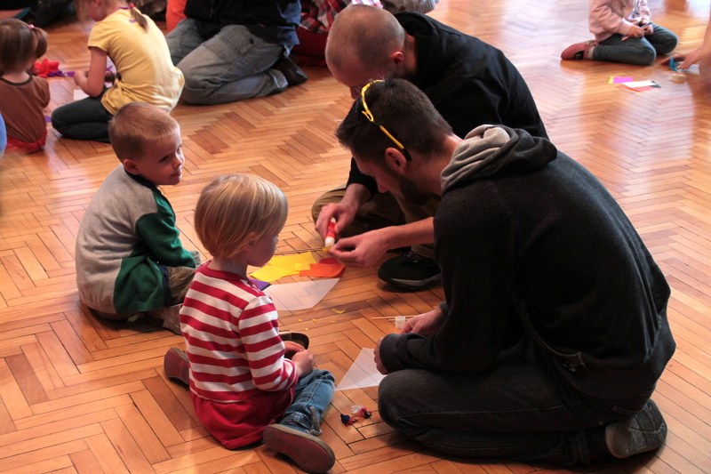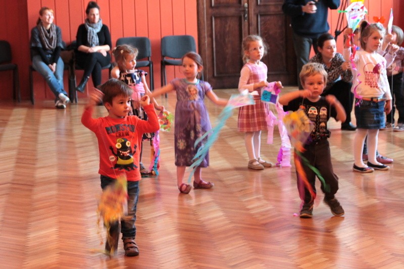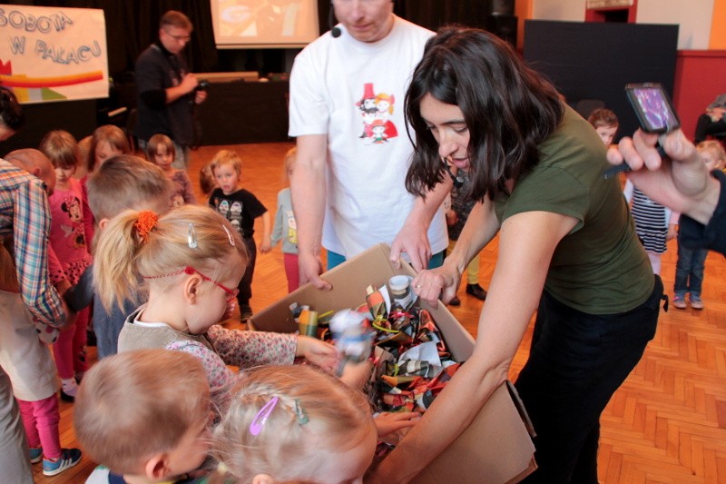 Podczas ostatniej SOBOTY W PAŁACU, dzieci wysłuchały historii o małym psie Astonie, który obchodził swoje pierwsze urodziny. Z tej okazji w jego domu pojawiło się wiele prezentów. Aston przesłał również wiele niespodzianek do Pałacu Młodzieży. Dzieci z wielką radością pomagały odpakować z papieru różne przedmioty. Były wśród nich krzesło, szczotki, młotek, deska a nawet… nocnik! Ach, ten Aston to ma fantazję! Uczestnikom naszych spotkań również jej nie brakuje! Dzieci jeździły po auli na wyimaginowanych rowerach /oczywiście nie zapomniały włożyć kasków!/, sprawdziły do czego może służyć deska, jak szybko turlają się kasztany i bardzo sprawnie pokonywały tor przeszkód. Na zakończenie zrobiły wraz z rodzicami własny latawiec, a do domu wróciły z drobnym prezentem – kreatywnym rzecz jasna! Nasze spotkania bowiem, mają pobudzać wyobraźnię i zachęcać do czytania!