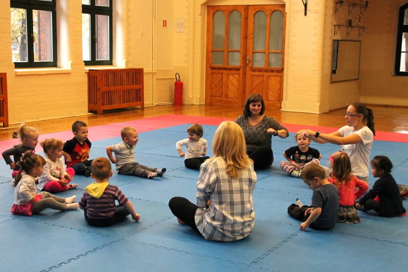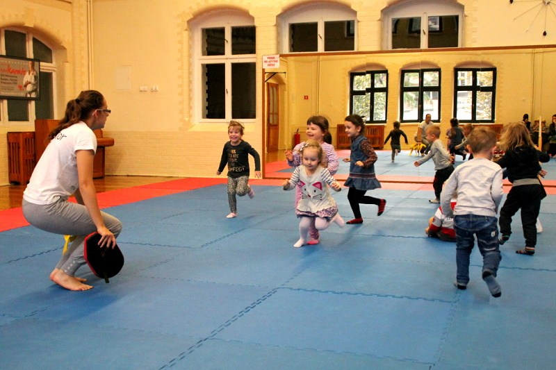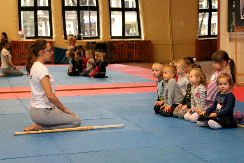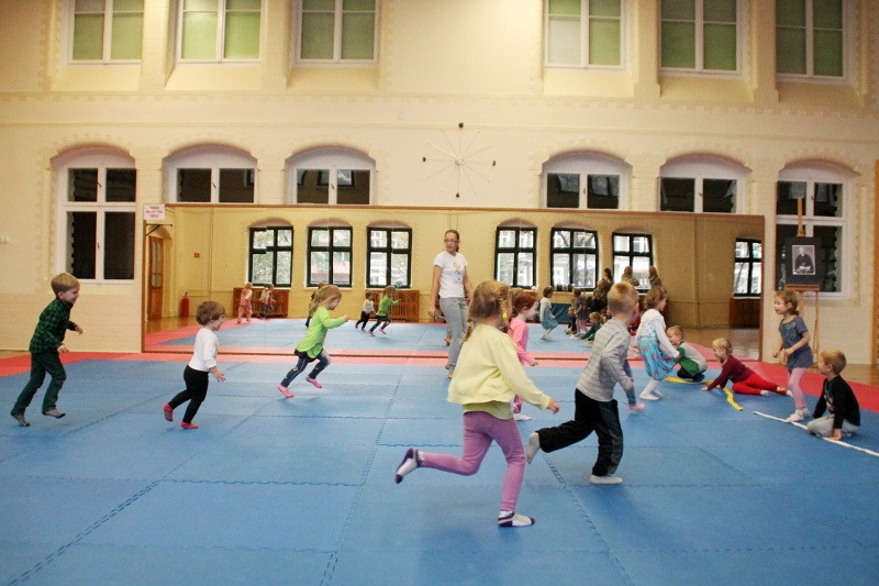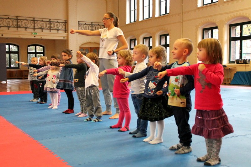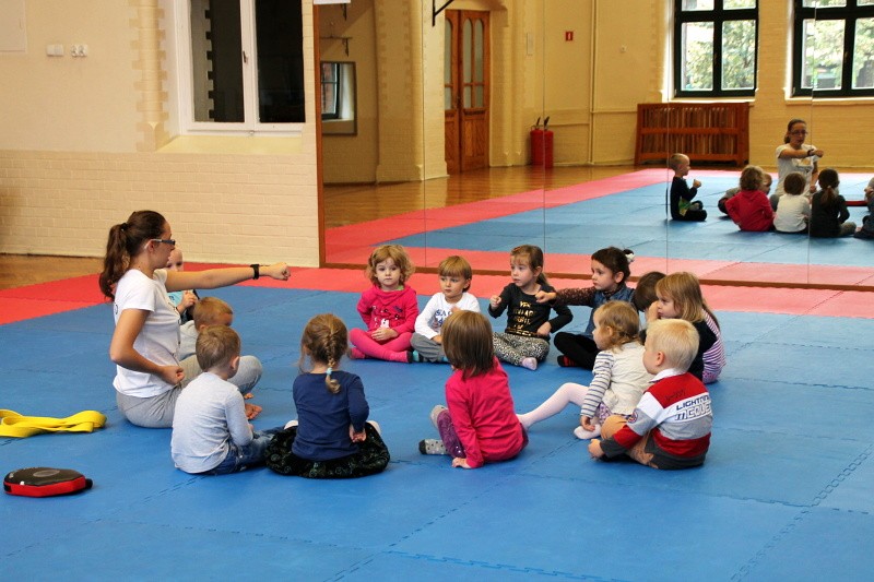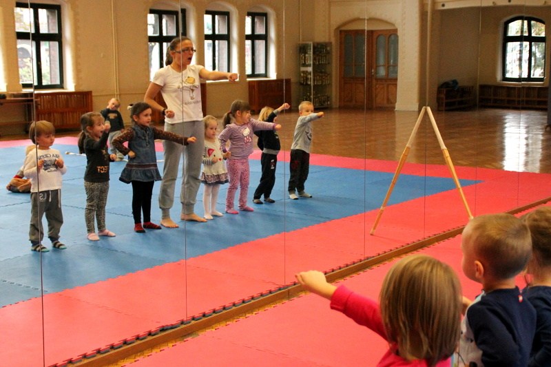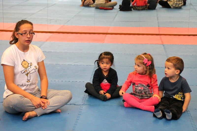 W środę, 15 października w Akademii Edukacji Przedszkolaka, odbyły się pierwsze zajęcia ruchowe z elementami karate. Projekt pod nazwą MAŁY KARATEKA, to cykliczne spotkania w trakcie których nasze przedszkolaki będą poznawały tę sztukę walki. Ćwiczenia i wiadomości są dostosowane do ich wieku. Podczas pierwszego spotkania sprawdzały na globusie, gdzie leży Japonia, dużo ćwiczyły i korzystały z przestrzeni jaką daje duuża pałacowa sala gimnastyczna!