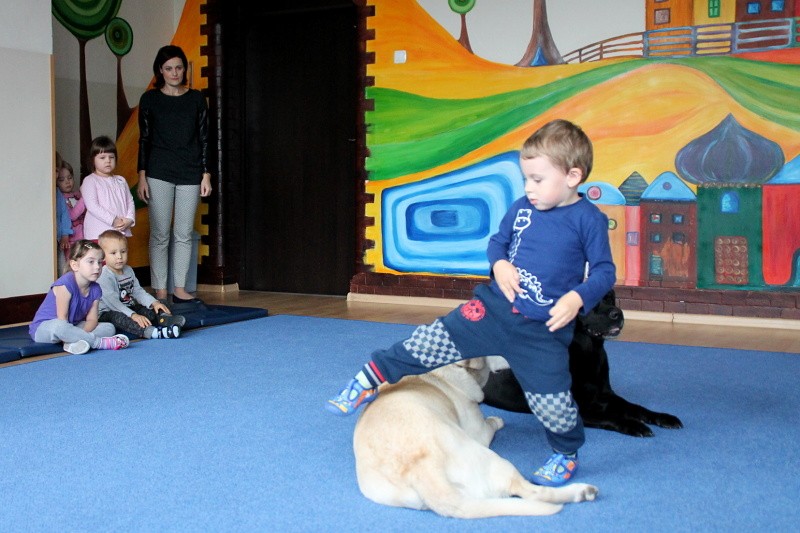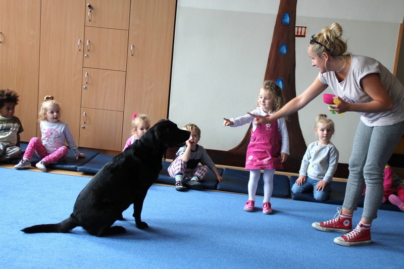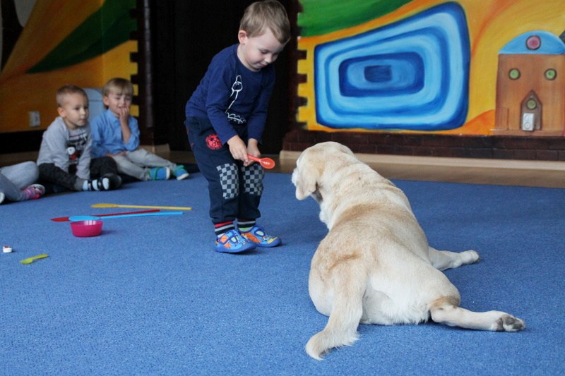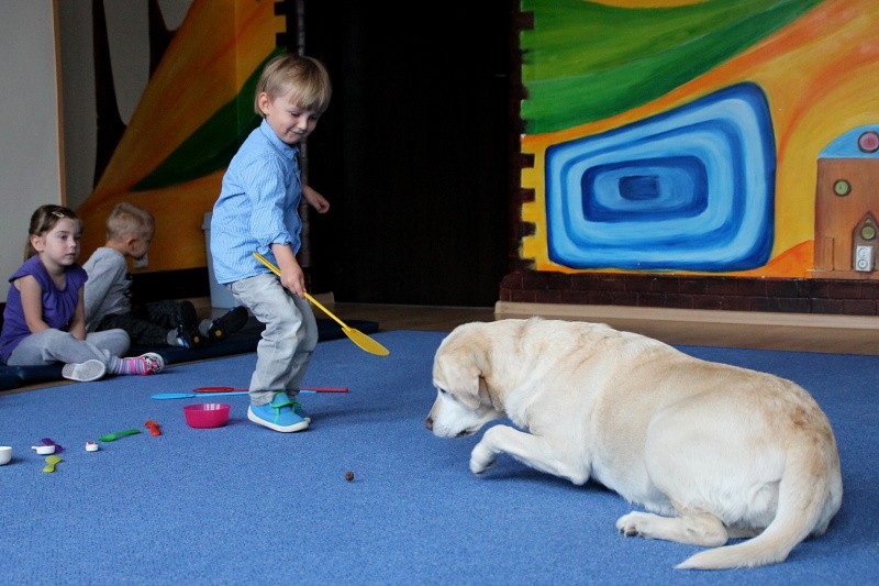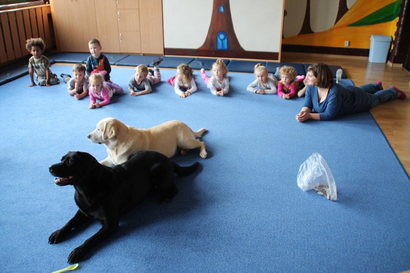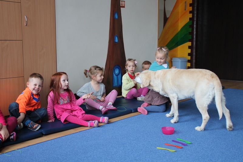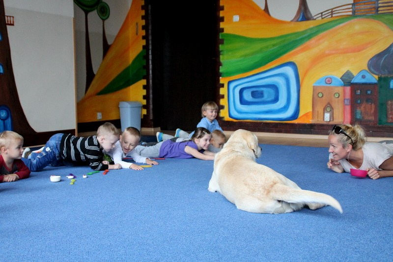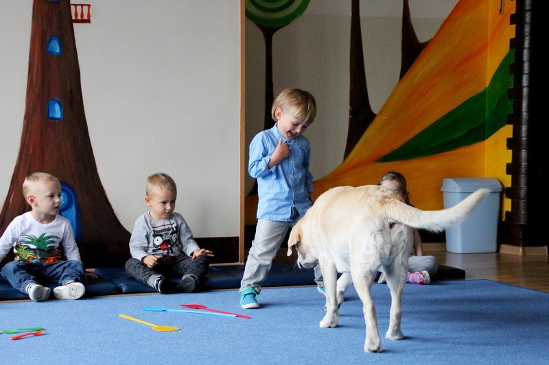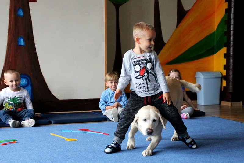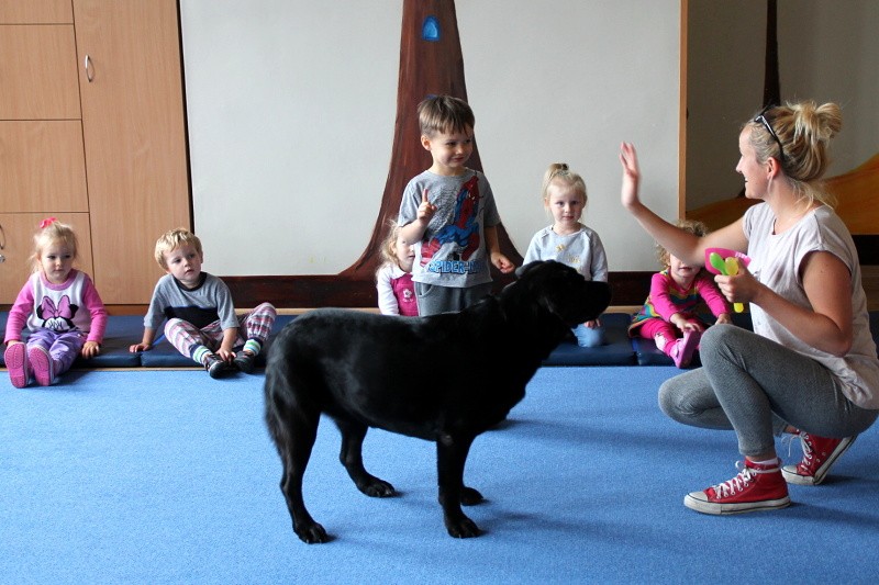 Pierwsze spotkanie z Aura i Bubą dostarczyło przedszkolakom wielu wrażeń. Dzieci polubiły pieski od pierwszego spojrzenia! Podczas zabaw z dwiema labradorkami, przedszkolaki przypominały sobie nazwy kolorów, ćwiczyły koordynację ruchową a przede wszystkim świetnie się bawiły. Czworonogi w nagrodę za dobrą współpracę dostały swoje smakołyki. Kolejne spotkanie w listopadzie!