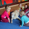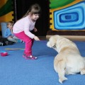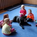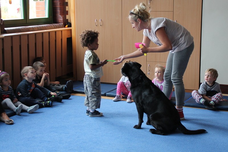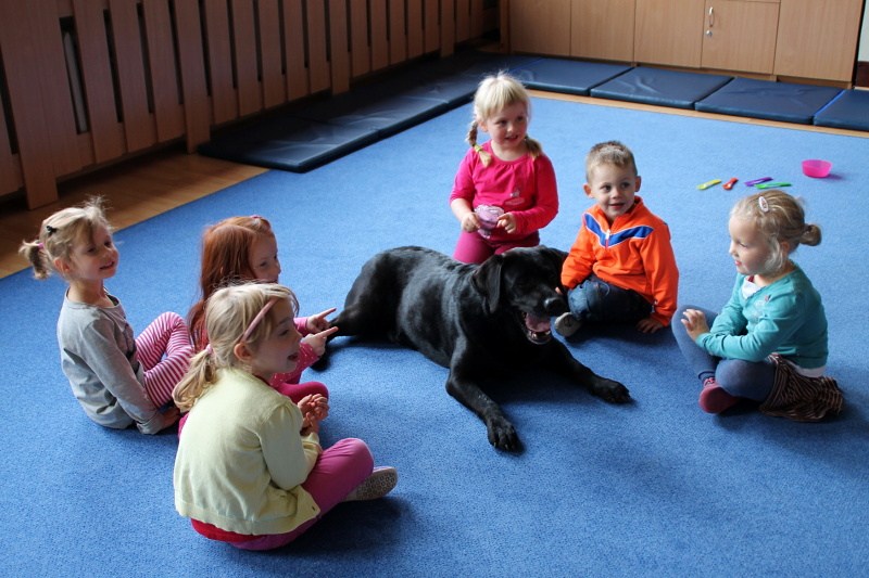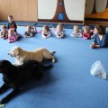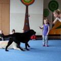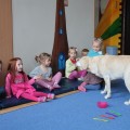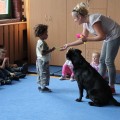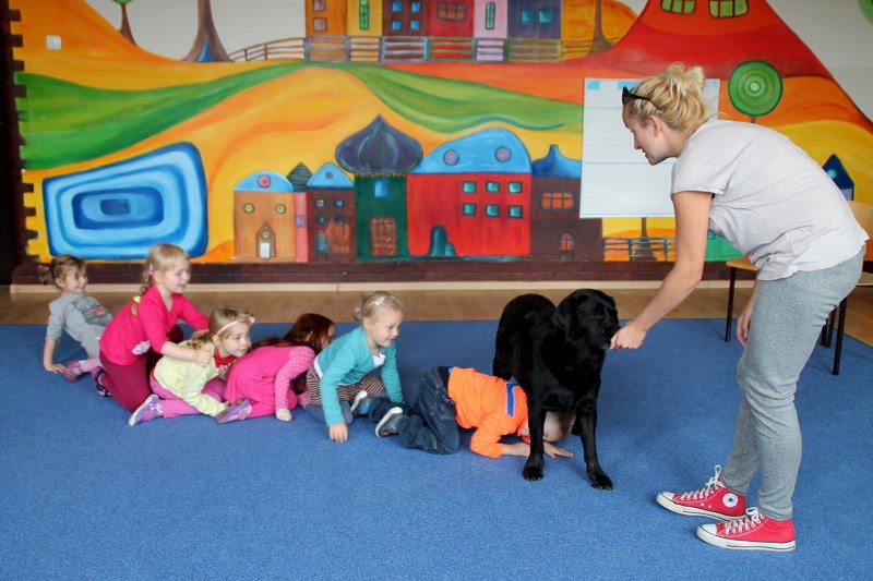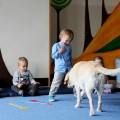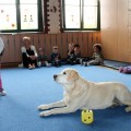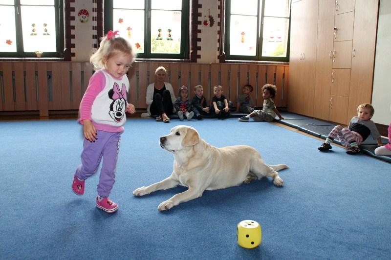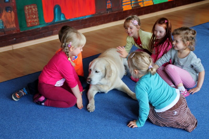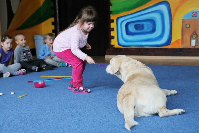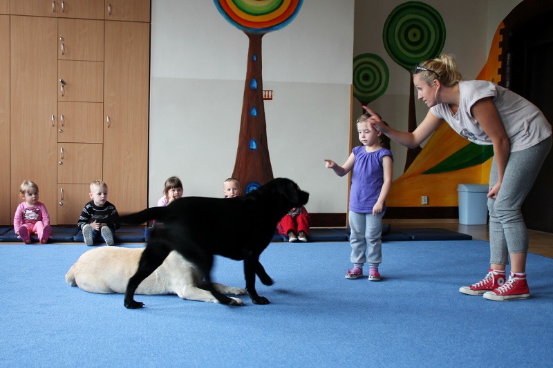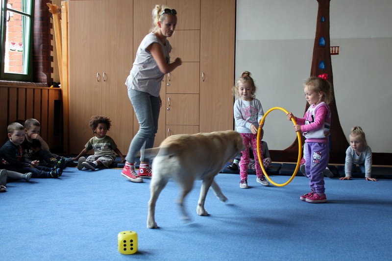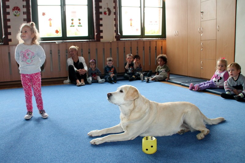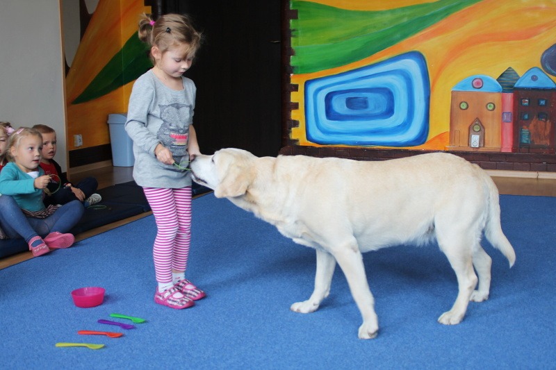 Pierwsze spotkanie z Aura i Bubą dostarczyło przedszkolakom wielu wrażeń. Dzieci polubiły pieski od pierwszego spojrzenia! Podczas zabaw z dwiema labradorkami, przedszkolaki przypominały sobie nazwy kolorów, ćwiczyły koordynację ruchową a przede wszystkim świetnie się bawiły. Czworonogi w nagrodę za dobrą współpracę dostały swoje smakołyki. Kolejne spotkanie w listopadzie!