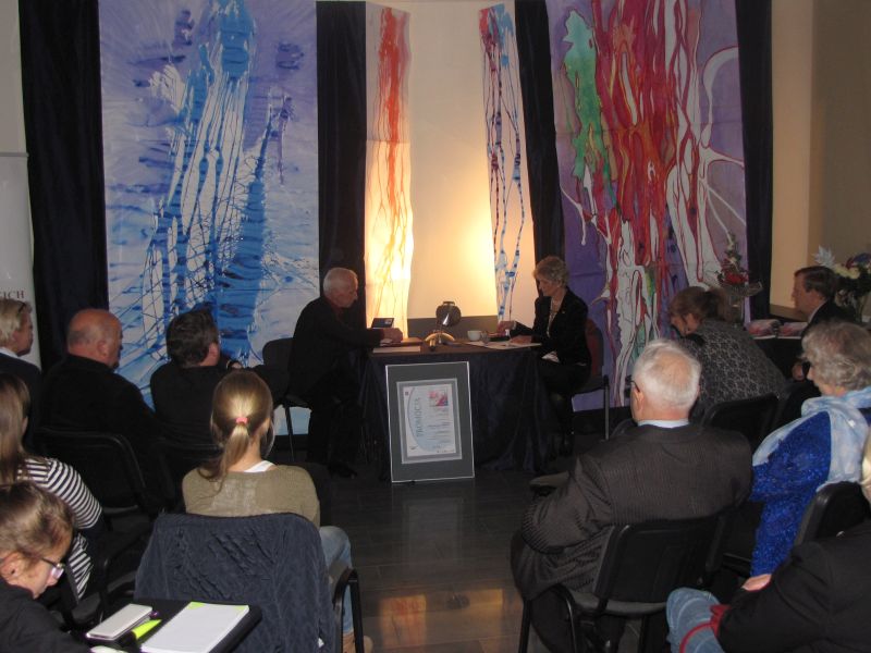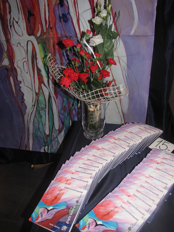 Sceneria jak zawsze artystyczna, prawdziwie tym razem malarska, spod ręki organizatorów, którzy wyczarowali w holu obok sali multimedialnej salonik kawowy, którego nie powstydziłyby się renomowane kawiarnie. Muzyka i światło dopełniały klimatu, w którym mogła zaistnieć Poezja. Bowiem to wiersze z tomu pod przekornym tytułem piąte koło u słowa… Zenona Lach zadowalały ucho słuchaczy. Wybrzmiały strofy wiersza My? zaprezentowane przez Grupę artystyczną Any Jakubczak, studentkę dziennikarstwa US. Dziewczyny z tremą, ale też z przejęciem otworzyły rozmowę o poezji, i nie tylko, Poety, byłego oficera Wojska Polskiego, autora tekstów piosenek, nie tylko żołnierskich, organizatora przedstawień i jurora konkursów recytatorskich. W dialogu z Różą Czerniawską-Karcz Autor mówił o swoich szkolnych początkach poetyckich w V LO w Szczecinie, o swoich doświadczeniach zawodowego żołnierza, a obecnie zgłębiającego i odkrywającego urodę i moc słowa. Zaistniała też malarka z Choszczna, Mirosława Kucharska, autorka obrazów, ilustrujących i dopełniających wiersze w tomiku poezji Zenona Lacha.