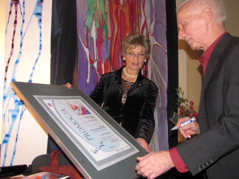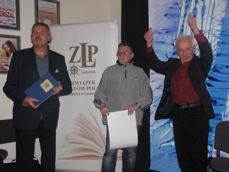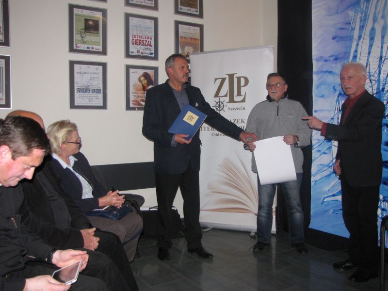 Nie można też zapomnieć o wystąpieniu prezesa ZLP w Szczecinie, Leszku Dembku, który na zakończenie wieczoru wystąpił z laudacją zilustrowaną wizualizacją w wykonaniu Zbigniewa Jahnza. Gratulacje i słowa uznania dla urody tomiku i dla poetyckiego słowa ofiarowano Autorowi, prosząc o dedykacje.